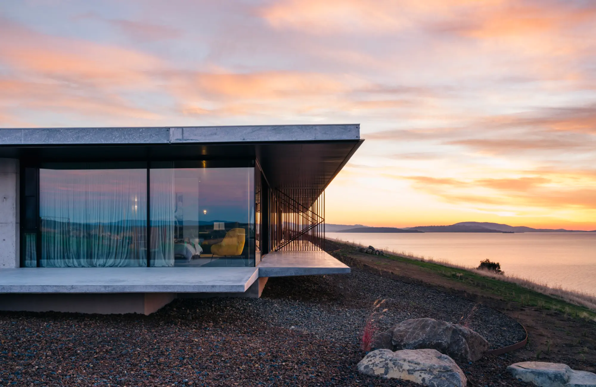The Point is a world class waterfront retreat sitting on 50 acres of rugged Tasmanian farming land, an adults only exclusive escape for six. The house and location are breath-taking: The house is nestled thoughtfully into the hill overlooking Frederick Henry Bay and May's Point surf break below and is just outside of Hobart Tasmania.