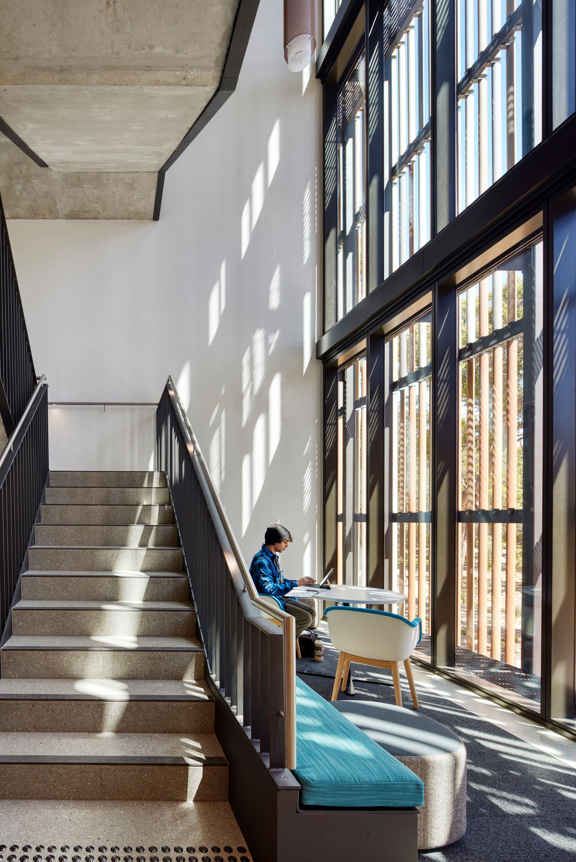 The building’s materials palette is simple and raw, chosen for its ability to complement the river and its robustness to withstand the rigours of a tertiary environment. Its colours were determined by the alluvial colours of the Swan River plain. Smoked eucalypt and marri are used throughout the building’s interior, together with off-form concrete and terrazzo floors. Vertical terracotta battens, in five colours and placed at different angles screen the building, create light, shadow and movement with the day’s changing light.