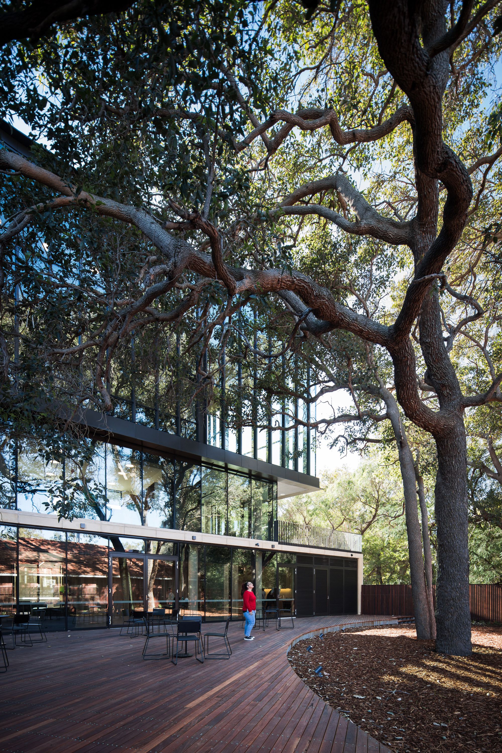 As important as bringing the river in, is the protection of a family of marri trees sited in the building envelope. “The cultural importance of these trees was highlighted at the outset of the design process,” says project architect Kate Moore. “Removing them was not an option, nor was separating them.” In fact, the family of trees became the anchor point for the building. Every effort was made to ensure that the construction did not negatively impact them, and the building was oriented around the trees to enable them to be seen from as many parts of the building as possible. Their significance is highlighted by their unobstructed view when entering through the building’s main entry.