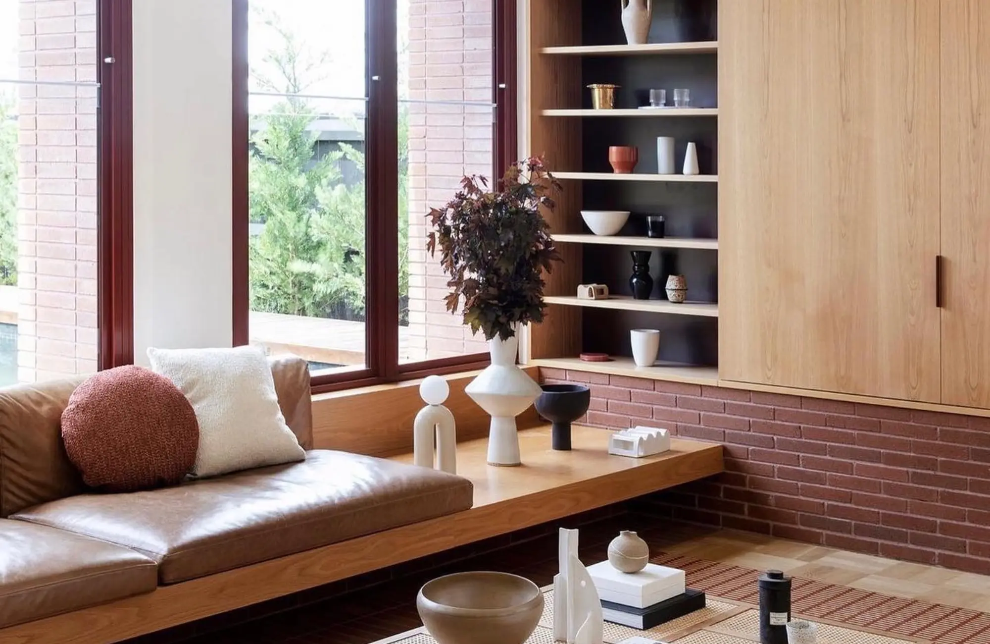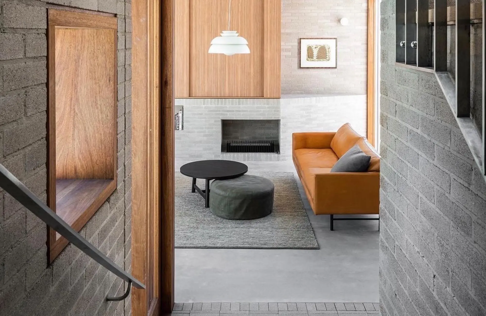 From the Architect: The design team were inspired by the home’s existing terrazzo thresholds and vitrified tiles to the fireplace, driving a tactile and layered material sensibility. Red stack bond brick forms a robust datum that grounds the open living spaces, complemented by the considered pairing of warm natural stone with Tasmanian oak and rattan joinery.