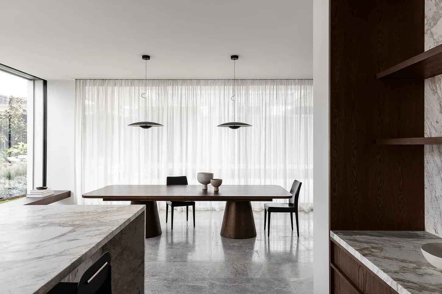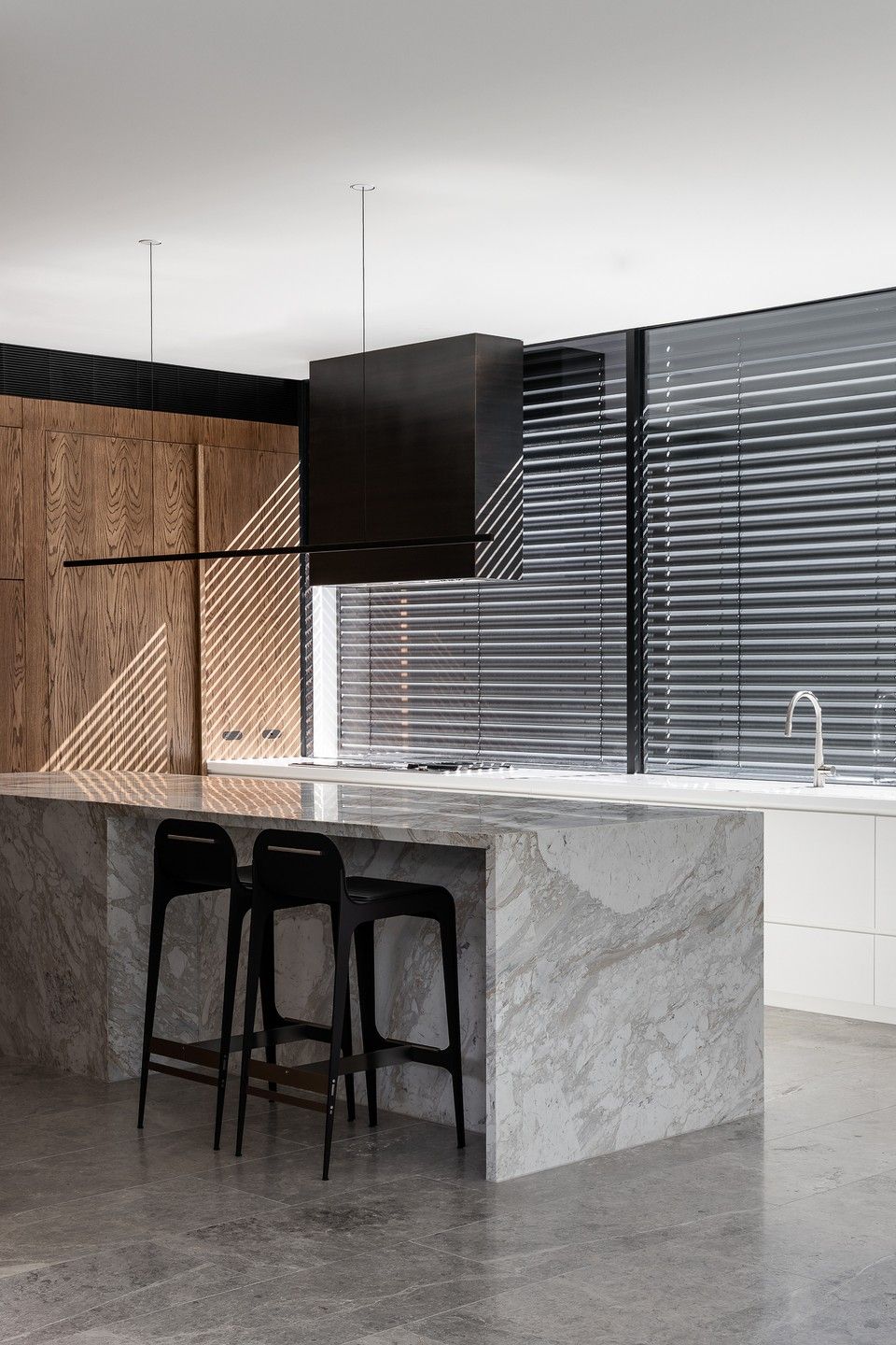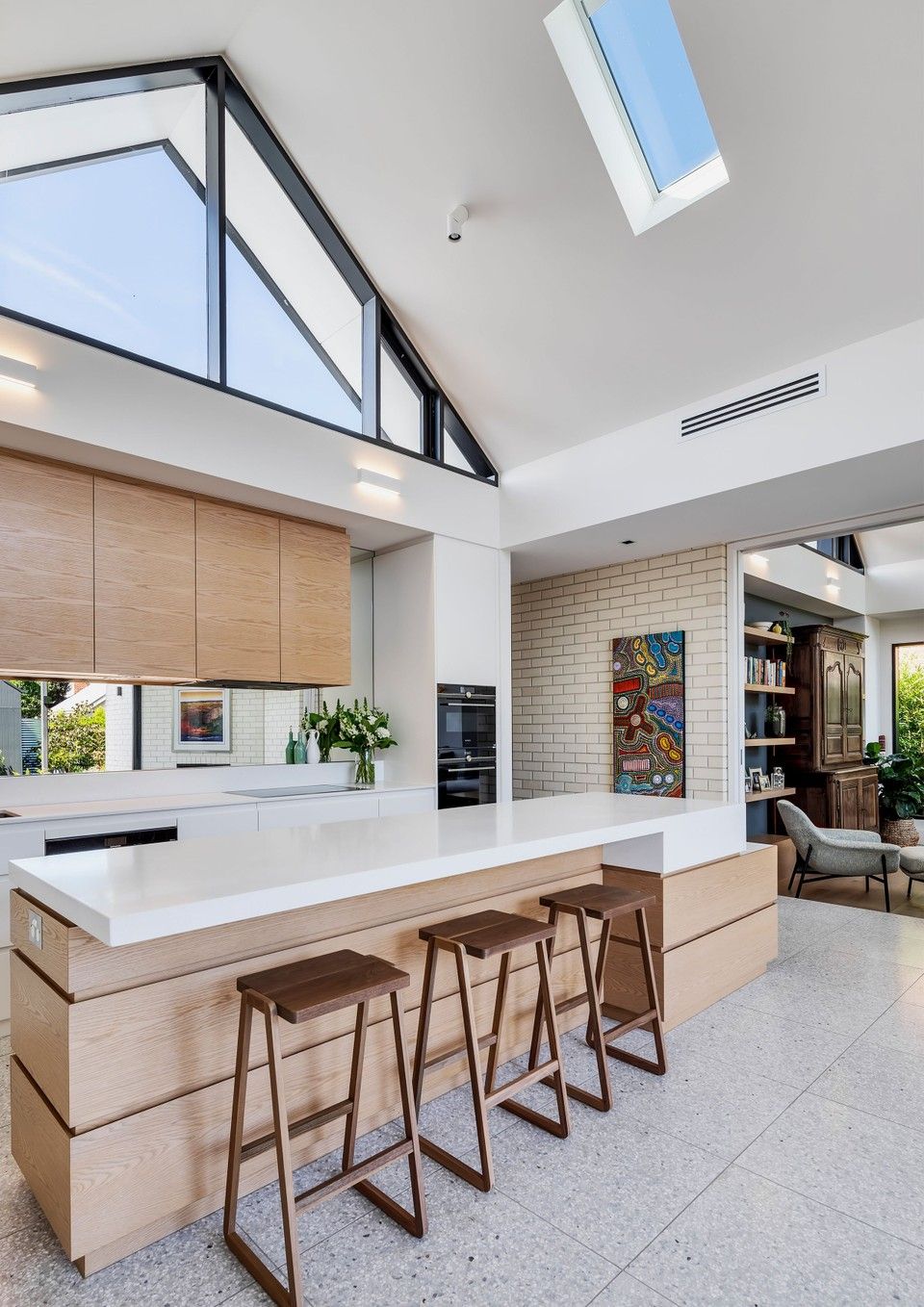 Internally the main entry hallway ‘gallery’, which is 3 meter wide x 4.5m high connects the Entry to the Kitchen/Living area, while a second hallway of equal size forms a connection to the private areas and a second intimate living area, and also two studies.