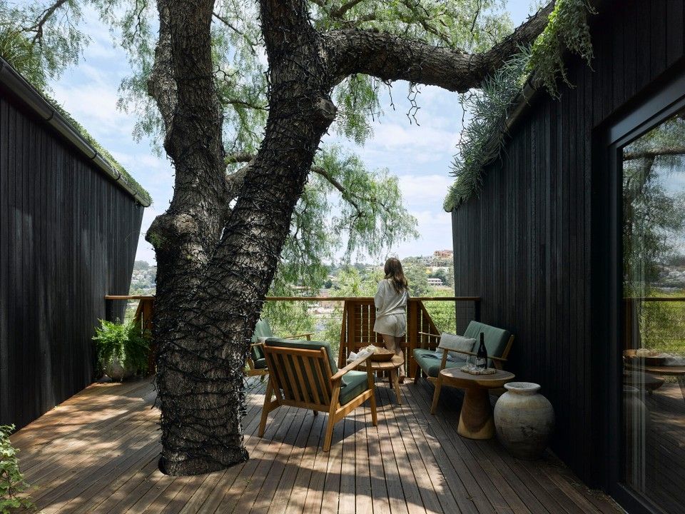 From the Architect: Pepper Tree Passive House is a compact secondary dwelling to a young family’s home in the Illawarra, NSW, perched on a steep site and elevated into the canopy of the site’s eponymous 60 year old Pepper Tree. Built to the international Passive House standard, true sustainability is at the core ethos of the project - embodied between the natural material palette, high performance design and strong biophilic connection. The two cantilevered wings each host a green roof, filled with native Australian plants, blending the building into the landscape.