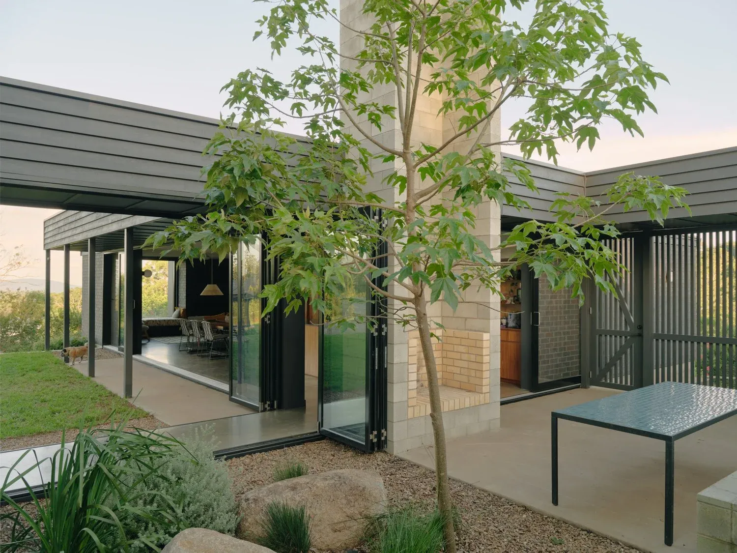 The house itself is pulled apart into a series of single storey modules that create a pinwheel plan which edits neighbours from the view and creates a series of three courtyards of different orientations, scale and typology. At the centre of this plan is the key ‘room’ of the house – a protected courtyard with a sculptural fireplace at its heart and the canopy of the gums above as its ceiling. The modules are positioned in a way that defines flat areas within the natural slope of the site that are open to sunlight and the view, but protected from neighbours and the cold south easterly winds that come up the valley.
