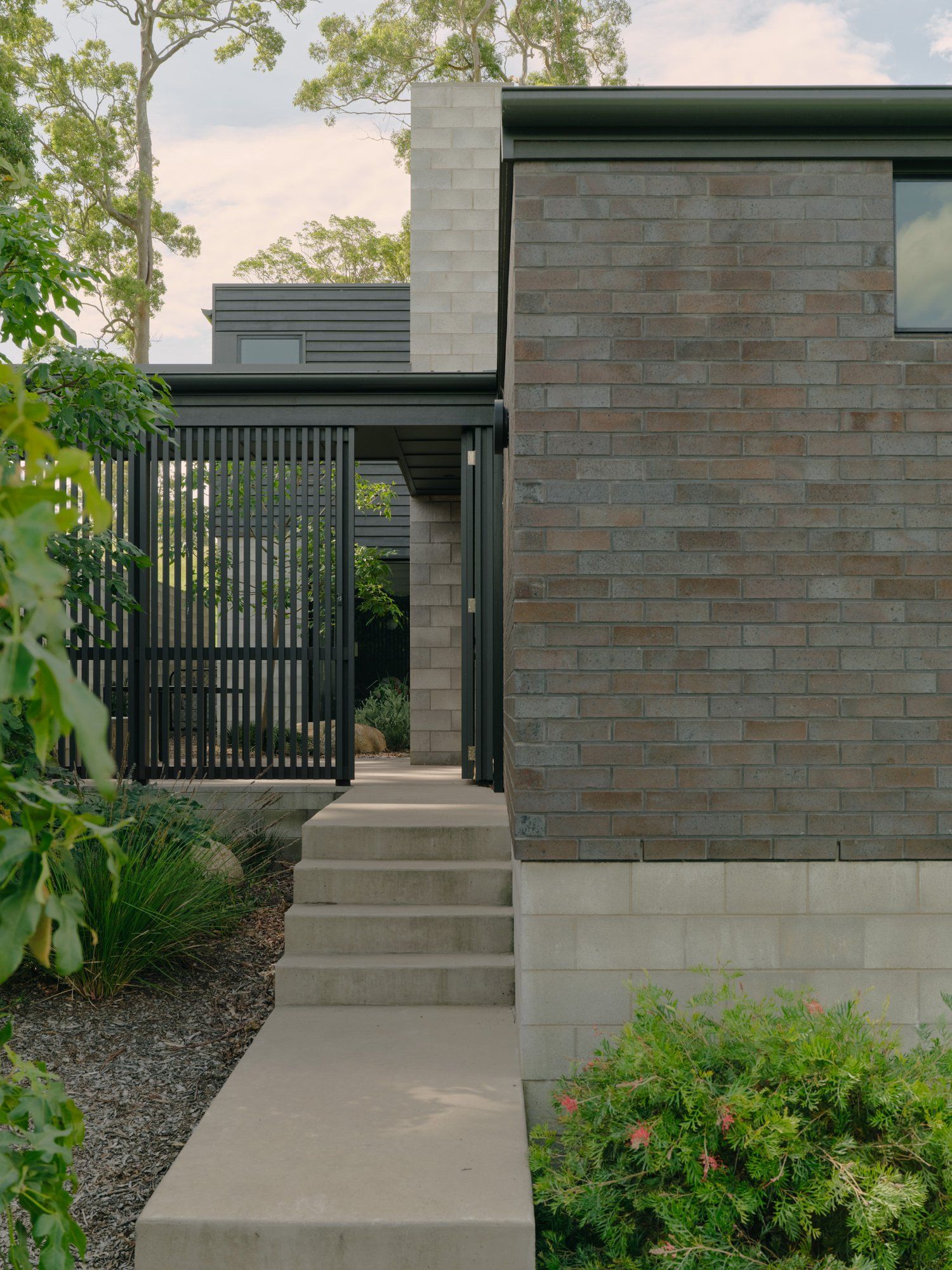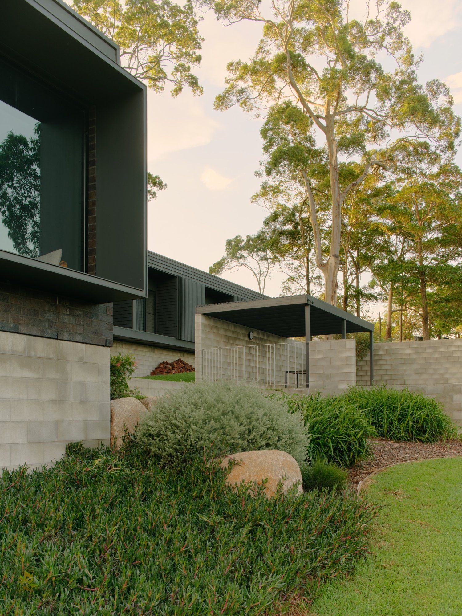 The block was one of the last remaining greenfield sites within a relatively new housing estate which had taken over a subdivided dairy farm. One approaches the block from above and across a small gully, and so the house and stand of trees are very visible from a long way away. Rather then trying to make the house into some kind of architectural statement, the project was conceived of as a quiet, horizontal shadow beneath the verticality of the gums above.