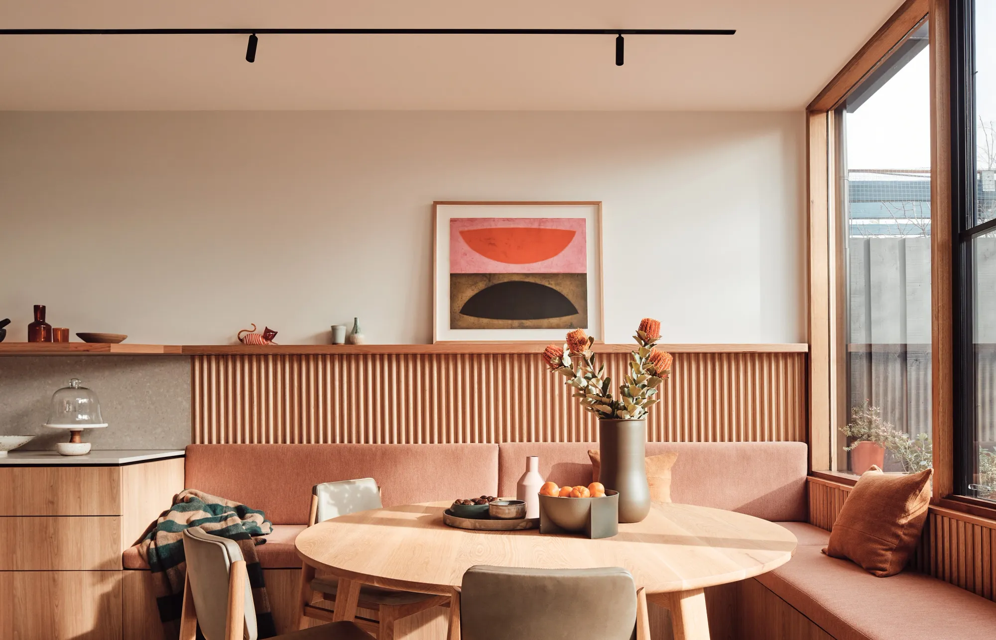 Minimising the home’s footprint where possible and opting for natural materials to help bring the outdoors in, the selection of local and sustainable Tasmanian Oak was also made. The timber was used throughout the home including in the kitchen joinery and banquette, the ceiling lining in the dining and sitting spaces, the rear windows and doors as well as the bespoke front door.