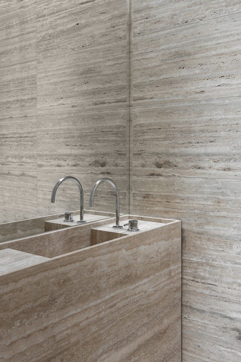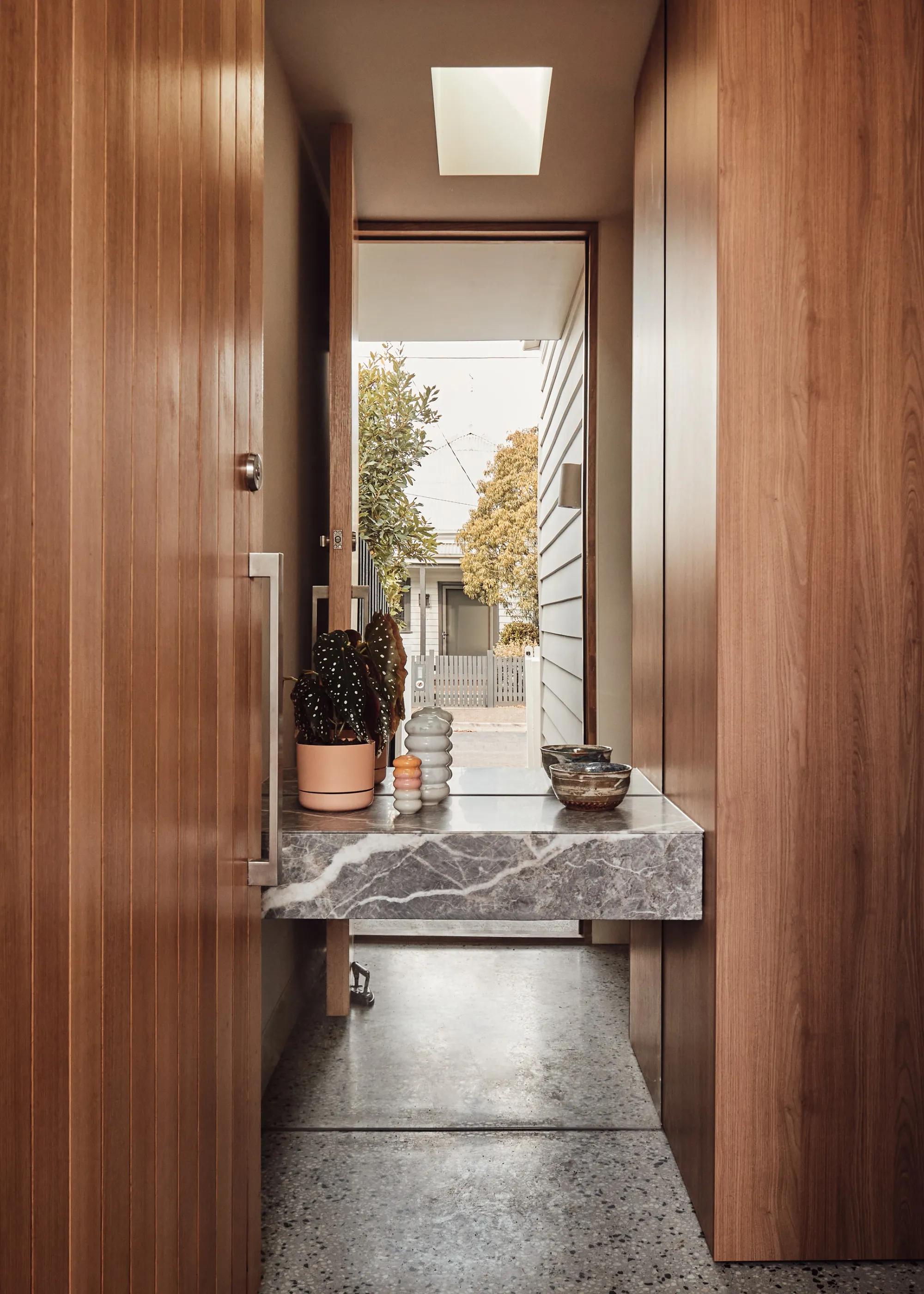 A reductive palette was carefully curated of robust materials that could be used in both external and internal applications, including a slimline concrete brick, travertine tiles, and charred timber. All three materials flow seamlessly from outside surfaces to interior,