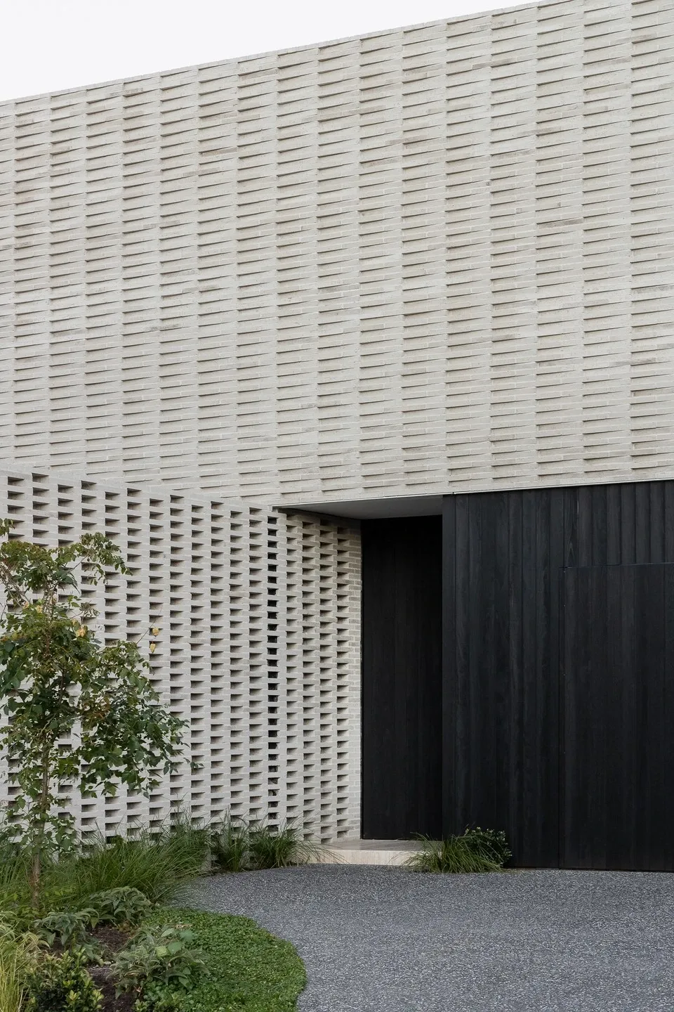 A concrete brick selected from National Masonry was used to give individual identity to the three key built forms that generate the arrangement of the house: on the colonnade, the occasional brick has been indented, or laid backwards to expose the darker rear side of the brick; a blade wall that stretches out towards the street is characterised by hit-and-miss brick patterning, providing dappled light and privacy to the front garden beyond; while the monolithic first floor façade is defined by angled bricks every second brick course, counteracting the massive expanse with delicate and textured detail.
