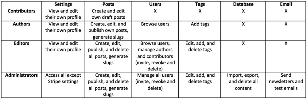 - Get familiar with your role. A role will automatically be assigned to your account - Contributor, author, editor and administrator. As you advance and build a portfolio of contributions, you may be asked to take on new responsibilities. The table below illustrates each users capabilities;