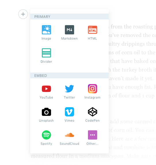 Having a clean writing experience is good, but nowadays great publishing means so much more than just text. Modern content contains audio, video, charts, data and interactive elements to provide an engaging experience.