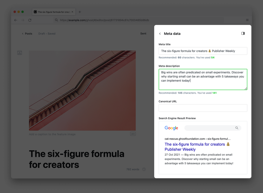 Best practice: Keep the meta title and description within the recommended character limit and write it for humans. Your meta data is what helps people decide whether to click on your article or not.