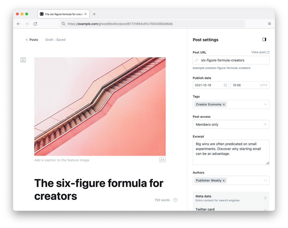 The post settings menu in the editor allows you to prepare your content for publishing with tags, post access levels, meta data and more.