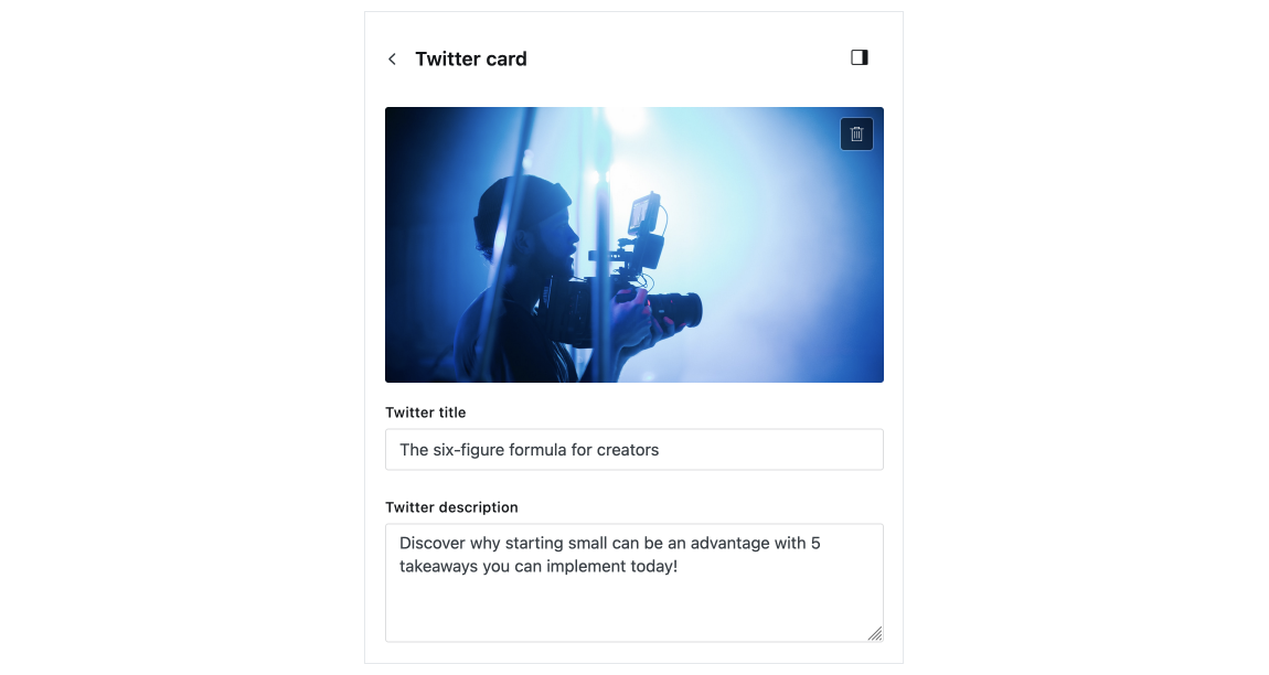 Tip: Use the Twitter card validator tool to check your Twitter card before sharing. When updating Twitter card information for a published post, it may take several minutes for Twitter to gather the latest data.