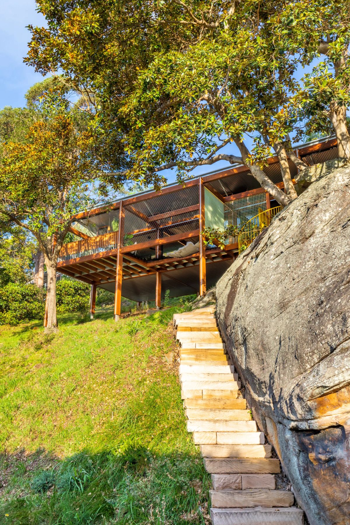 Balmy Palmy House elegantly celebrates the joys of modesty and the art of simple living. Perched firmly on a challenging incline, this enchanting sanctuary embraces its place amidst the lush bushland canopy, effortlessly enveloping you in nature's warm embrace.
