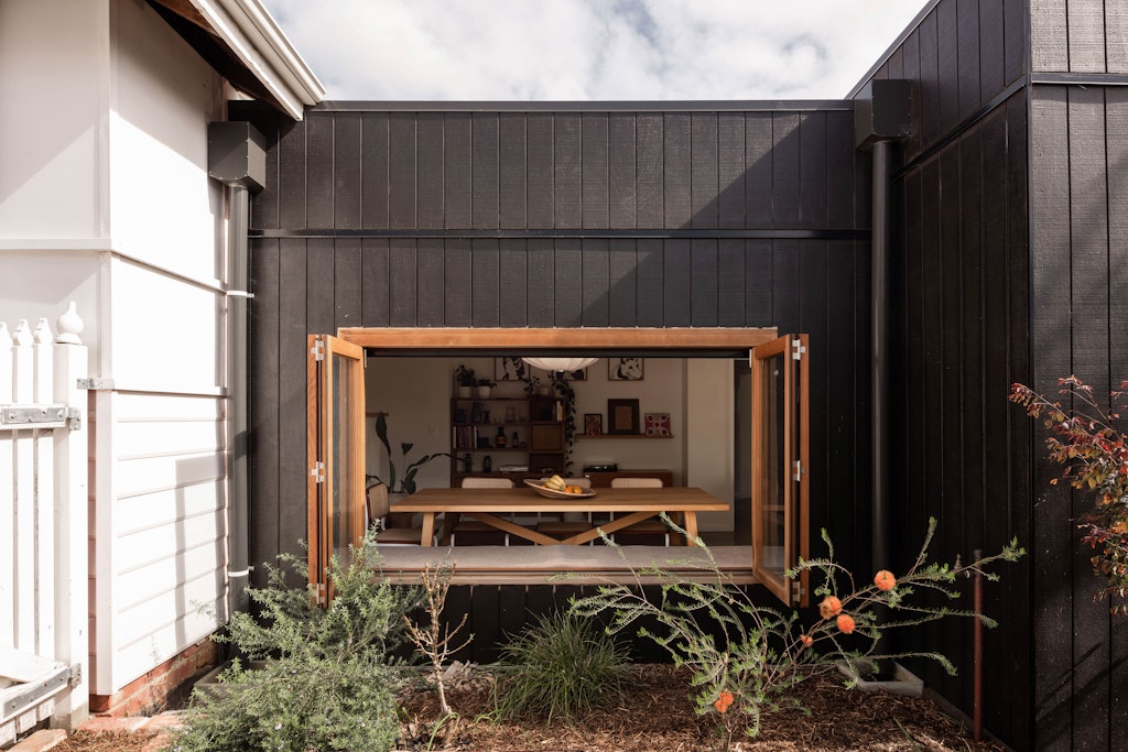Simone’s view that architecture is working well when it serves “as a backdrop to the lives of the client” is clearly evident in her design with the original weatherboard cottage at the front of the site retained, renovated, celebrated and married to the addition to the rear. The elegant, functional, north-facing rear addition, clad in charcoal Shadowclad, recedes into the surrounding garden while serving as a striking contrast to the original white weatherboard cottage at the front of the property with its pitched terracotta tiled roof.