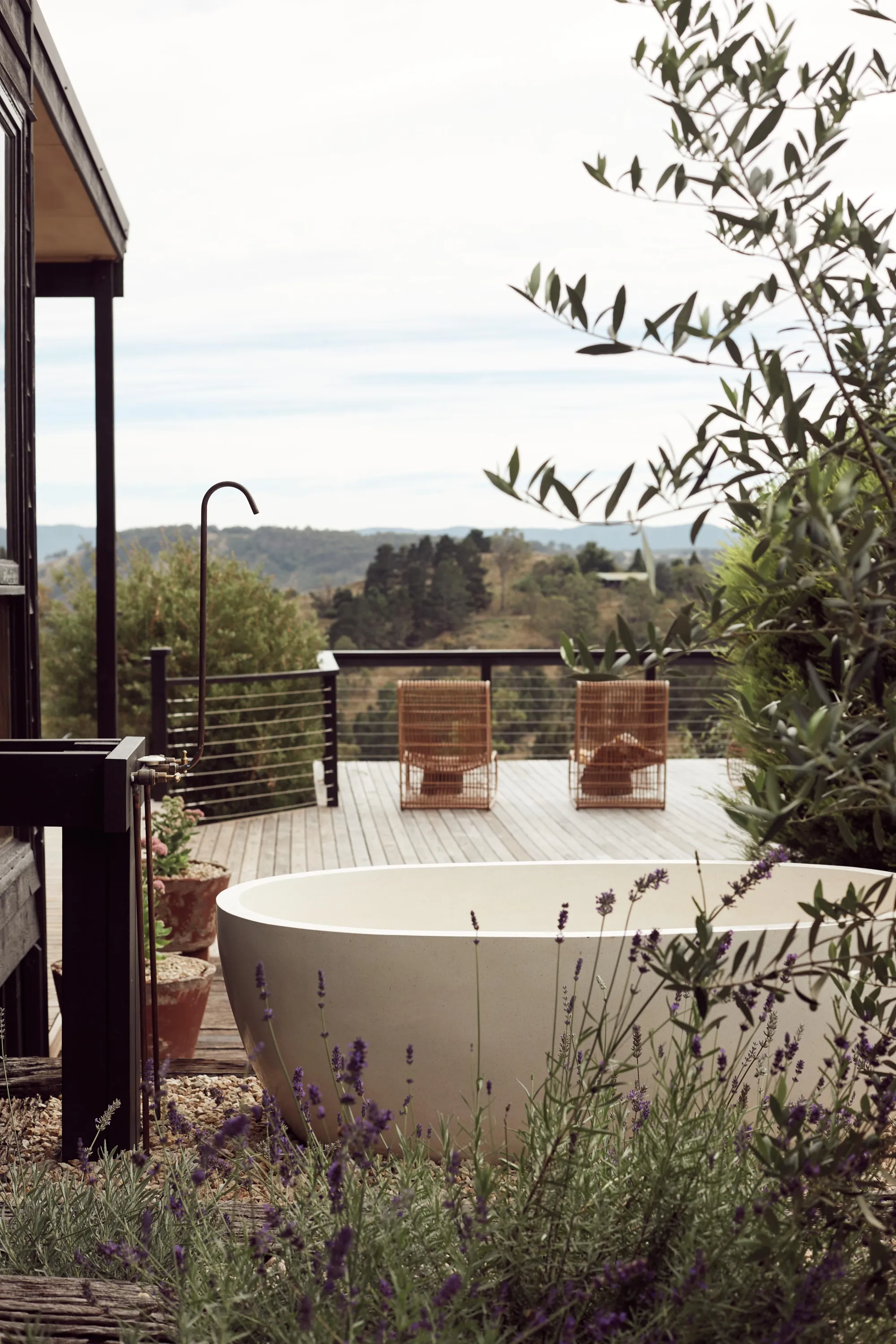 The sole accommodation on the working apple farm is the Machinery Shed, Asia and Sam's first accommodation. Inspired by the New York loft style, this stay has a unique charm to it. Using the bones of the old shed, Asia and Sam have been able to create a special space that celebrates the history of the building whilst also creating a luxury experience for their guests. The two show stoppers though, are both bath tubs locations, one internally and the other located a short walk away externally. They are both positioned thoughtfully to take advantage of the stunning views Logan Brae has to offer.