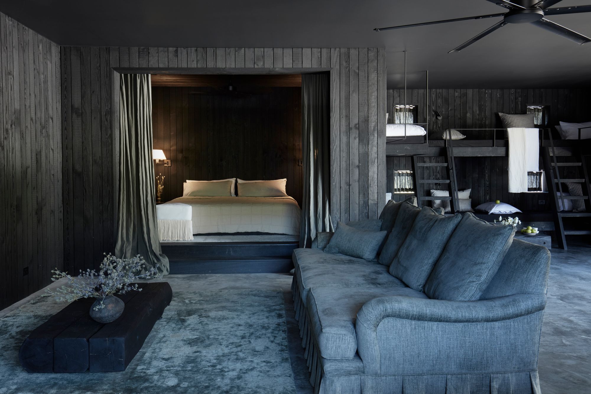 The Studio serves as the ideal accommodation solution for larger groups with its open-plan design facilitating six custom bunk beds, two single beds, and an elevated, generously proportioned alcove featuring a super king bed.