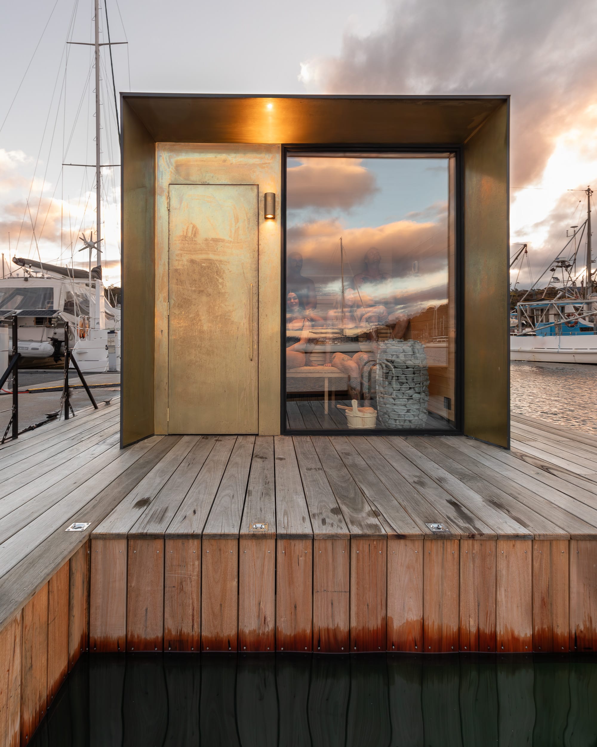 The façade of the boat pays homage to traditional boat building techniques with a full brass wrap; which doubles as a representation of the Sauna Boat's own life, both past and upcoming. Designed to patina beautifully over time, the brass will serve as a living artwork of all the guests that have journeyed with the boat, and who each play a role in its evolving colouration and history. This rich façade is accompanied by Shou-Sugi Ban Tasmanian Oak, which softens the boats appearance from afar and allows it to blend seamlessly with its natural surroundings.