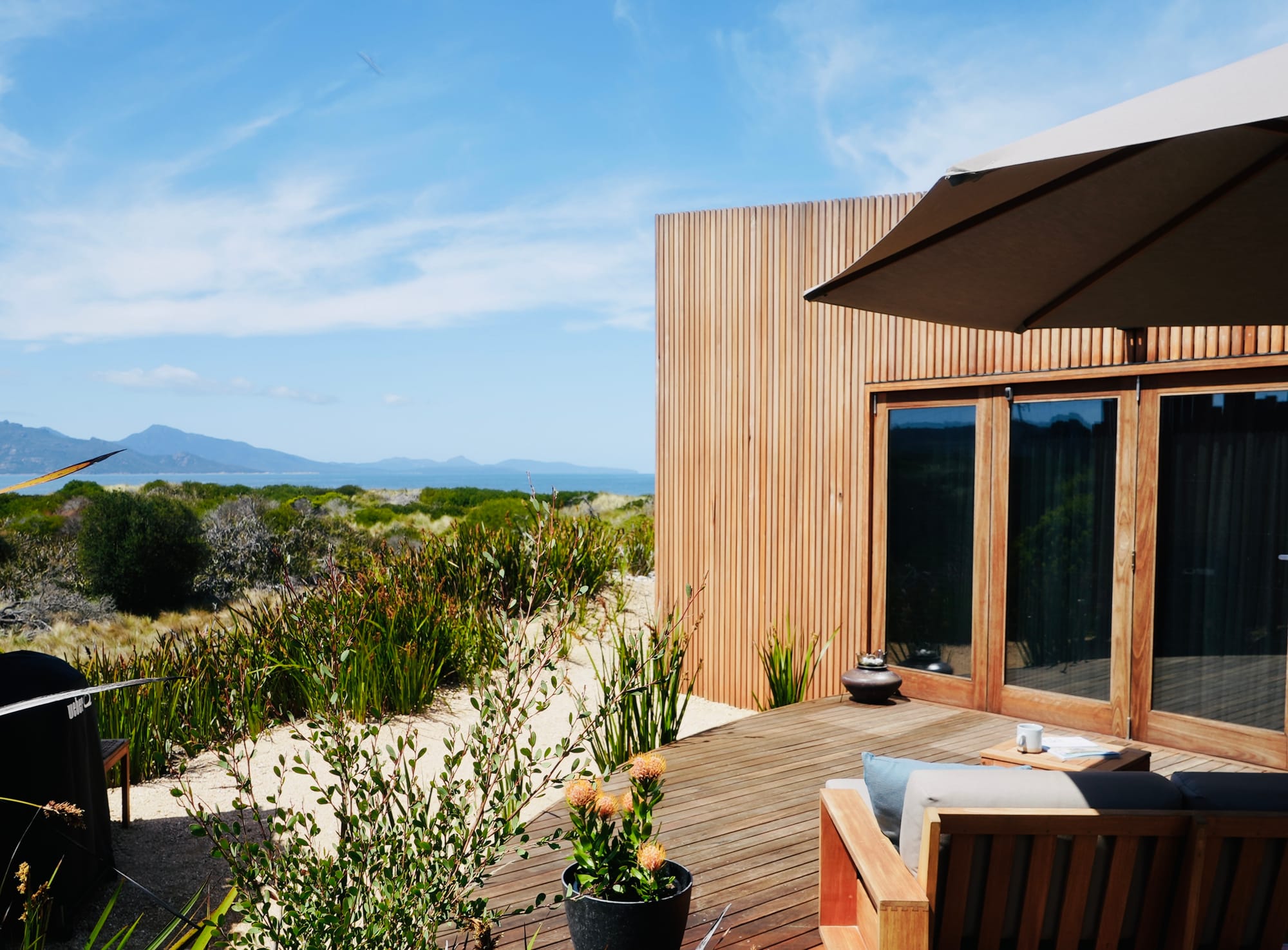 With the studio's strategic positioning it offers guests stunning vistas of the Freycinet Peninsula and Great Oyster Bay. Inspired by the concept of a viewfinder, the architectural form is angled to frame these breathtaking views, creating a dynamic interaction between the indoors and the ever-changing Tasmanian landscape. This design choice is not just about aesthetics; it's a conscious effort to deepen the guests' connection with the surroundings.