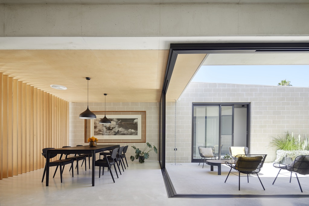 With the site running predominantly north-south, perforated blade walls external to the house not only help screen out the harsh eastern and western sun but also help frame semi-enclosed outdoor spaces facing on to the street – much like the front loggias of the neighbouring Mediterranean homes. These semi-enclosed spaces make the front of the house a more useable place to be and foster a closer relationship with the street and neighbourhood.