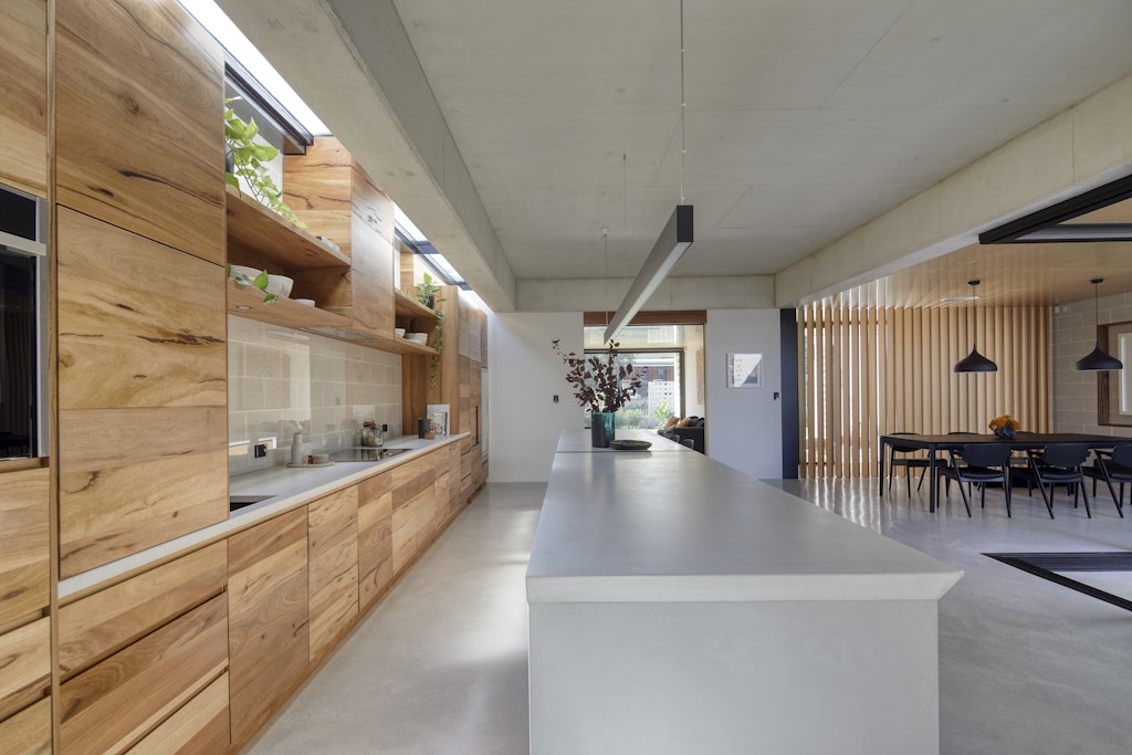 What many residential architects in Perth have come to learn is that painted exterior finishes and complex detailing are unlikely to do either the client or architect many favours in the longer term against the local conditions of driving winds and a scathing summer sun. Materials in this house are therefore prefaced by durability and longevity. Complimenting the masonry walls, there are no painted finishes externally nor plasterboard ceilings internally. Plywood, set against burnished concrete floors, off-form soffits, polished benchtops, and marri timber cabinet work amplify the home’s textural and tonal qualities.