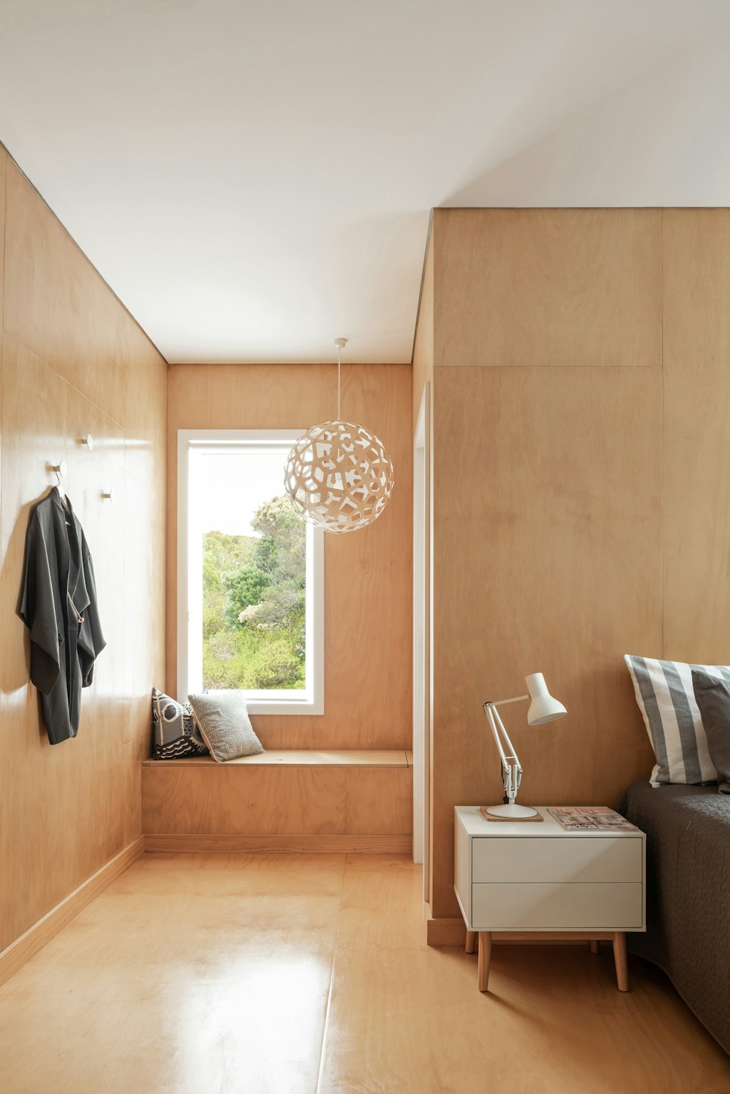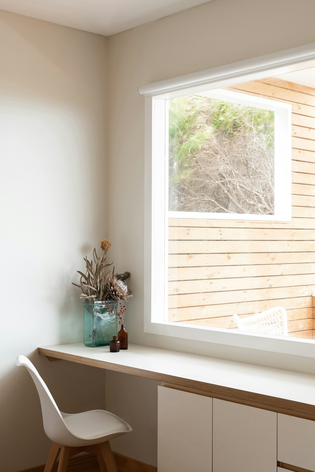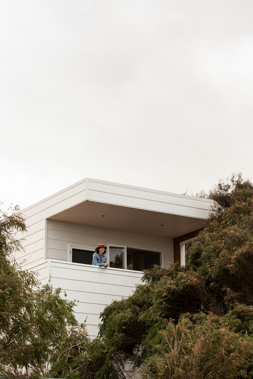 The house strikes a simple cubic form with white painted fibre cement weatherboard cladding. It is tightly detailed to resist the salt spray of the harsh coastal environment. Stainless steel nails, no carbon steel and painted timber windows form part of the comprehensive weather resistance strategy. Inside the building, the walls are lined with plywood for warmth and the space is adorned with a series of picture windows that peer into the treescape and are countered by a large window overlooking the bay. The simplicity of the building is in part a result of sensible construction techniques that required little oversight from the architect given the project’s location.