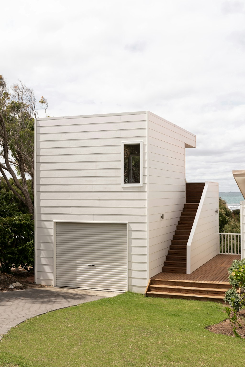 It is in this context that the Augusta Boat House is situated. It is a small, free-standing addition to an existing holiday cottage, intended to provide extra space for a growing extended family to holiday together. The ground floor of the new building is a flexible space dedicated to table tennis or fishing, just big enough to store a 14-foot boat and its associated fishing equipment. Upstairs via an external staircase which appears to wrap around the building, the upper floor provides a bedroom / study with an ensuite and a small deck. Standing as a discreet building and nestled into the peppermint trees without fences, the building pops above the tree line providing views from the deck over Flinders Bay and to the constant parade of whales that move along the shore.