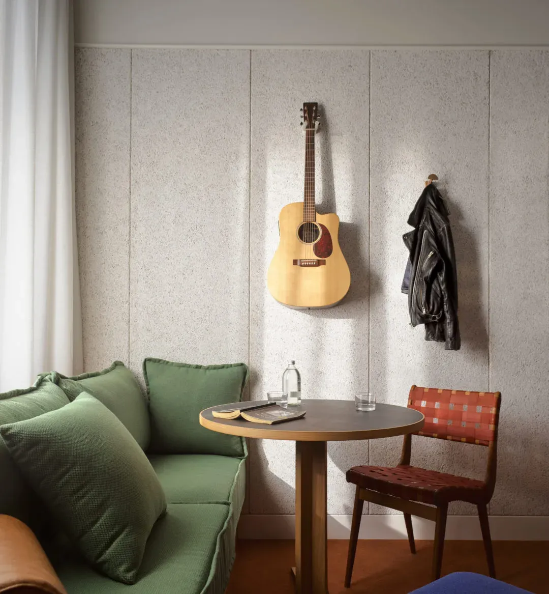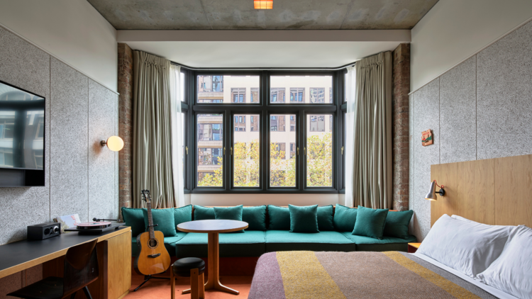 The hotel’s guest rooms — designed by Flack Studio to feel cosy and residential, with custom lighting, furniture and fixtures throughout.