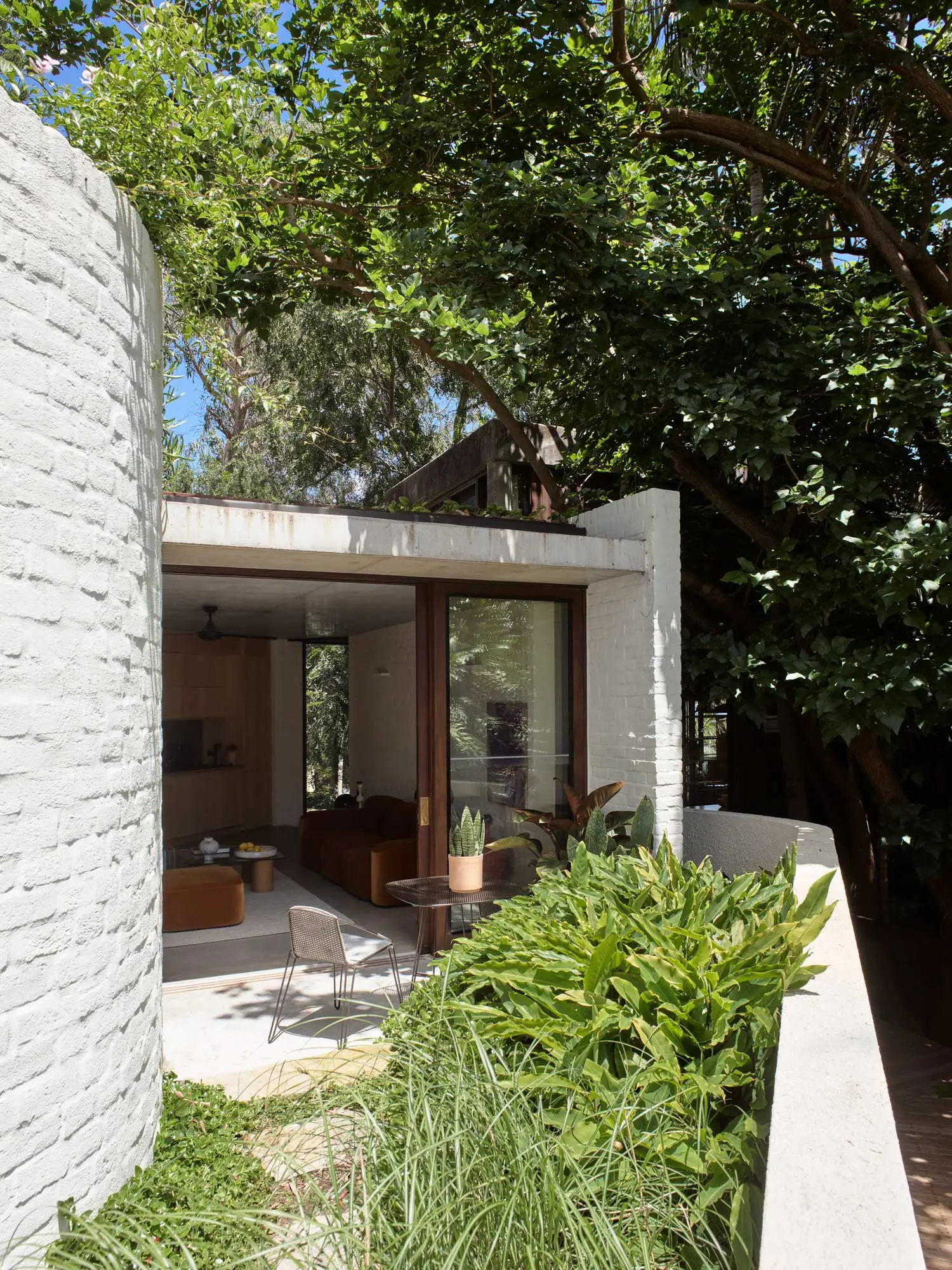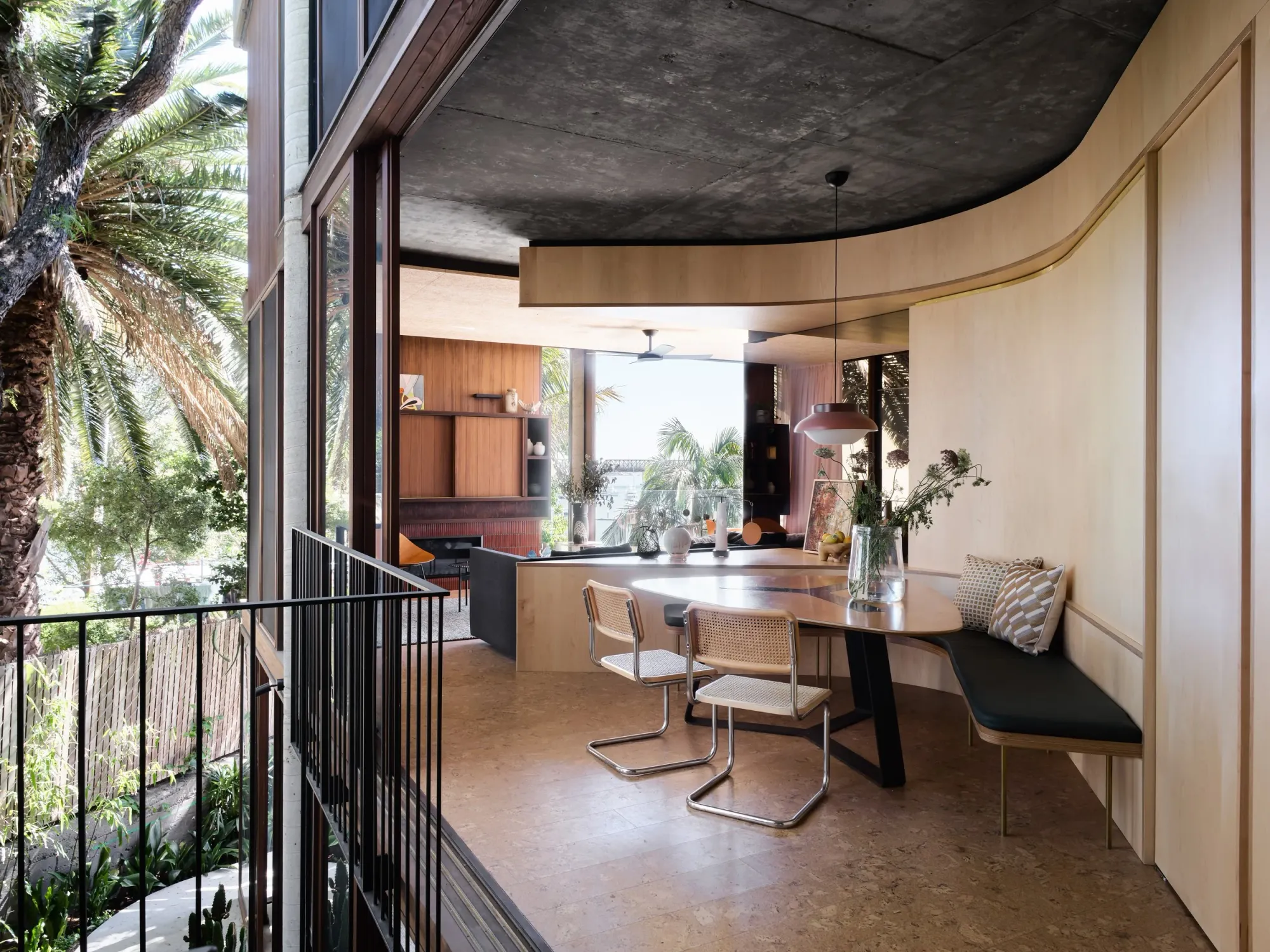 The house is one of a pair of heritage-listed semis, built in 1972 on a steep waterfront site looking across the Parramatta River towards Iron Cove to the south, and Birkenhead Point to the west.