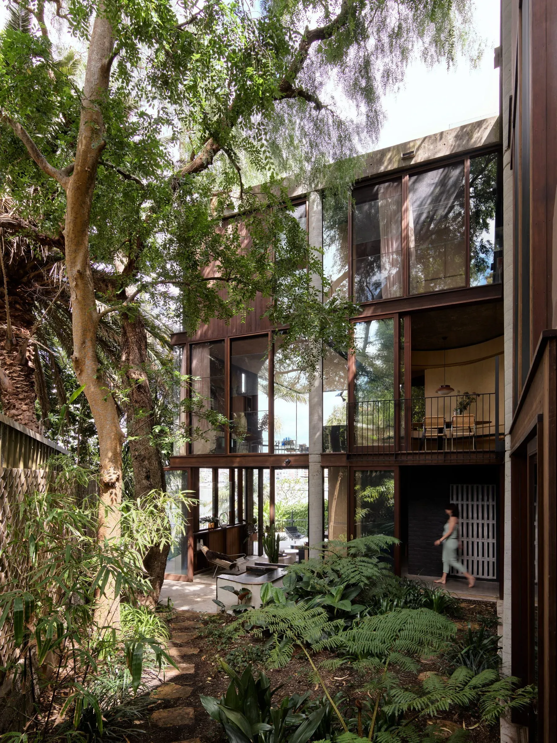 Built at a 45 degree angle to the street, the semi zig-zags along the south boundary to side-step trees and sand- stone outcrops. Its three-storey concrete pillar and slab construction was infilled with floor-to-ceiling fixed glass. The superstructure was solid, but its timber cladding and windows were beyond repair. Inside, much of the original interior had been covered up and painted, concealing its materials and character. With no opening windows to the south and west façades, and an uninsulated flat roof, the building suffered extreme heat gain in summer and loss in winter. It relied on a commercial-scale air-conditioning whose mechanical plant occupied half the lower ground level.