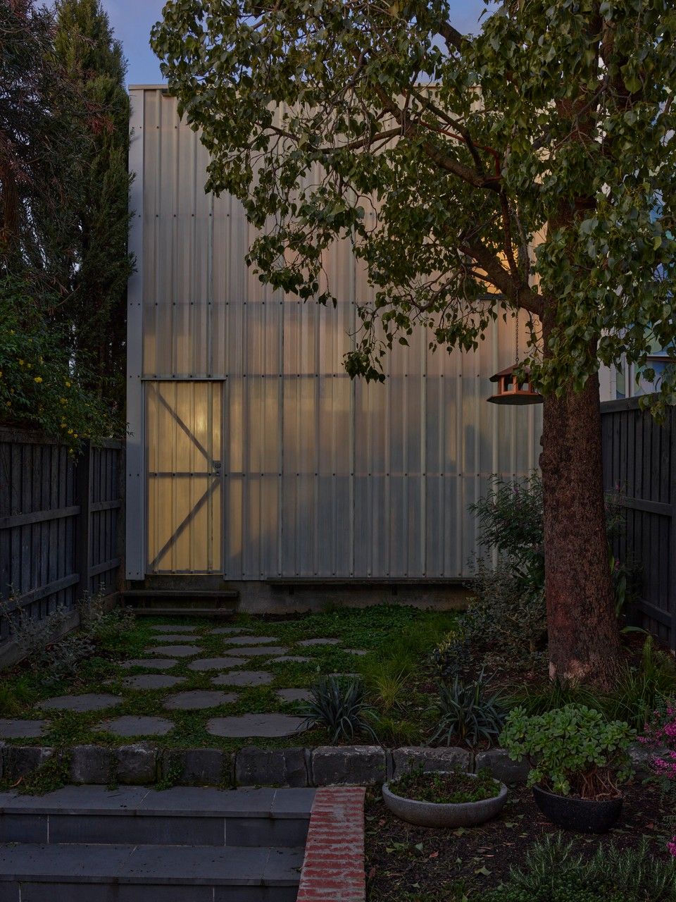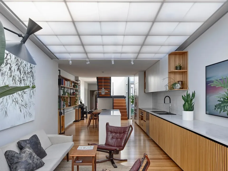 From the Architect: Modification of the terrace house in the inner suburb of Melbourne is a continued exploration of spaces after family occupancy. The project aims to reflect and celebrate the previously designed ‘Studio Garage Façade’ by incorporating the polycarbonate sheeting into the roof and ceiling of the living and kitchen area, opening onto the backyard, forming a pergola. The angled polycarbonate roofing combined with an open plan of the residence’s corridor through to the backyard visually connects the indoors to the outdoors. This open plan was made possible by relocating the kitchen and deleting the corridor in between the living and the backyard area.