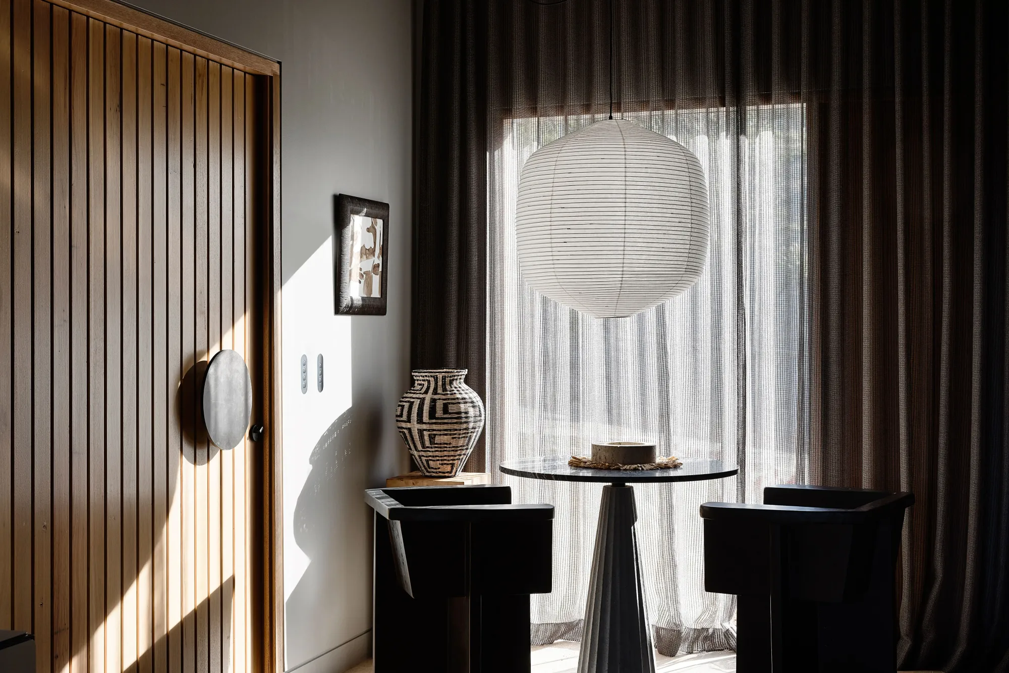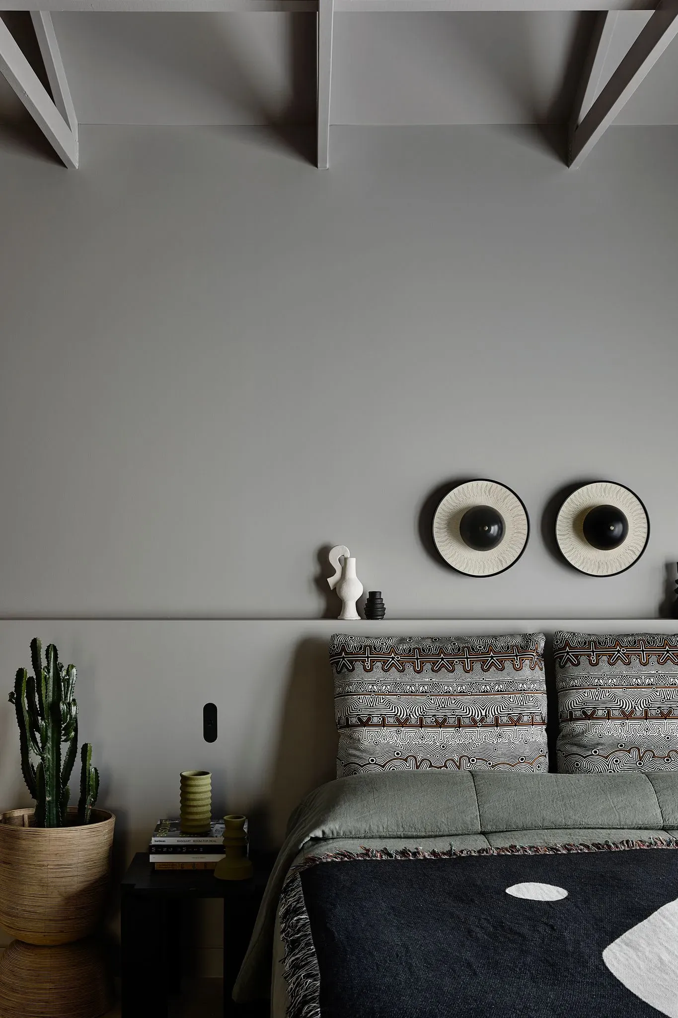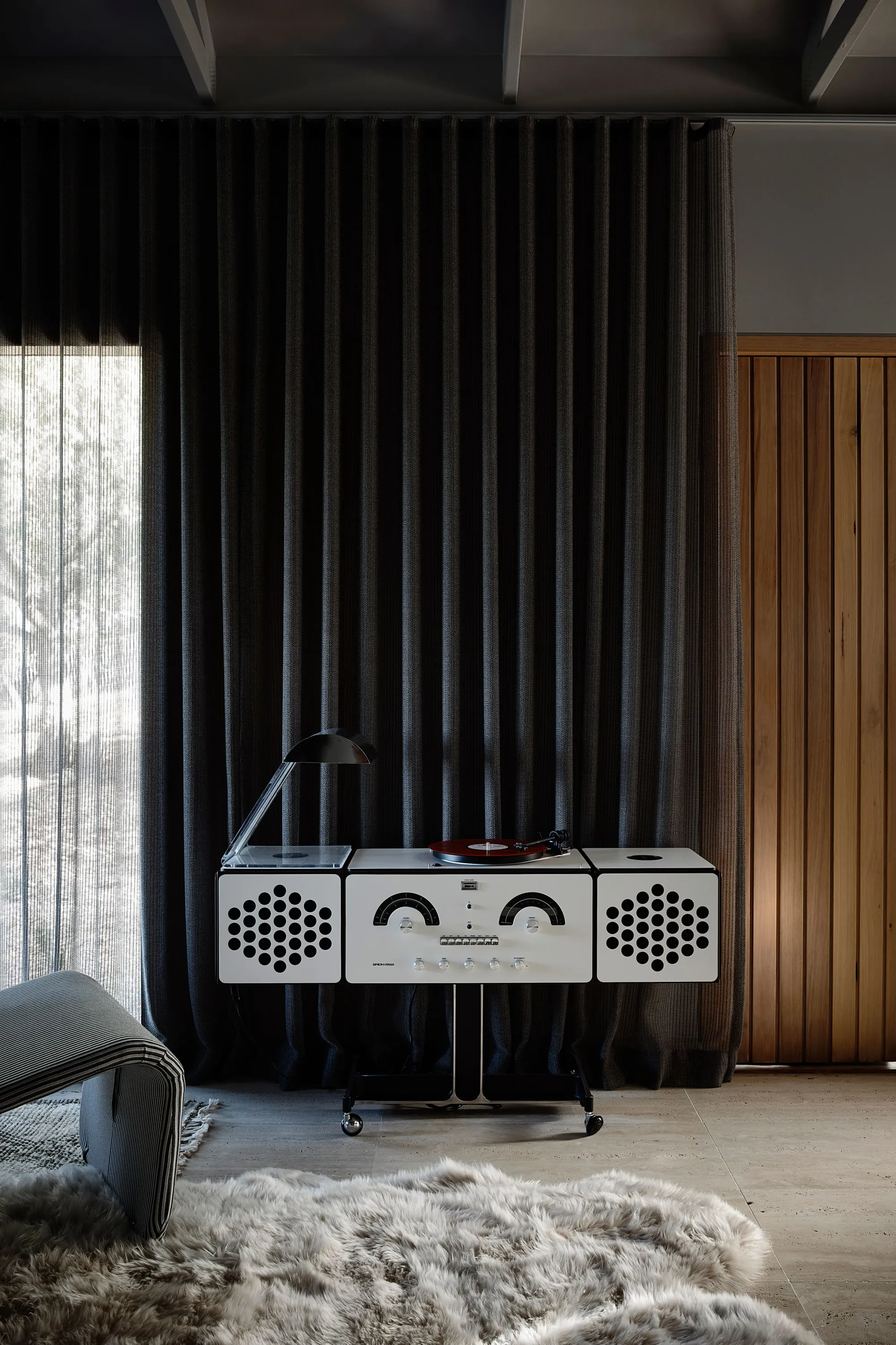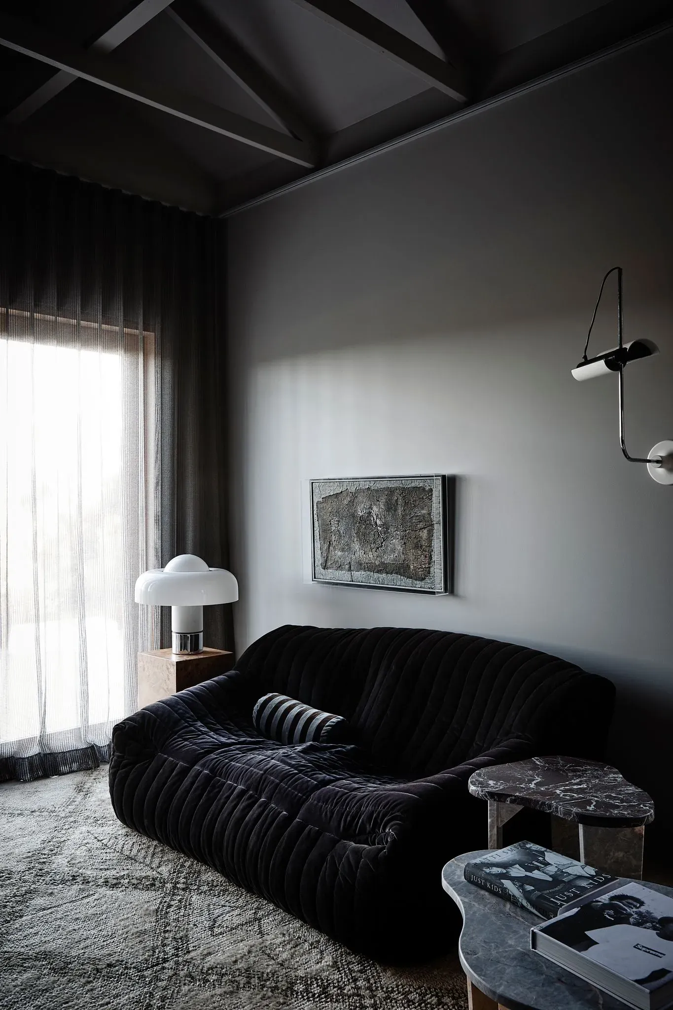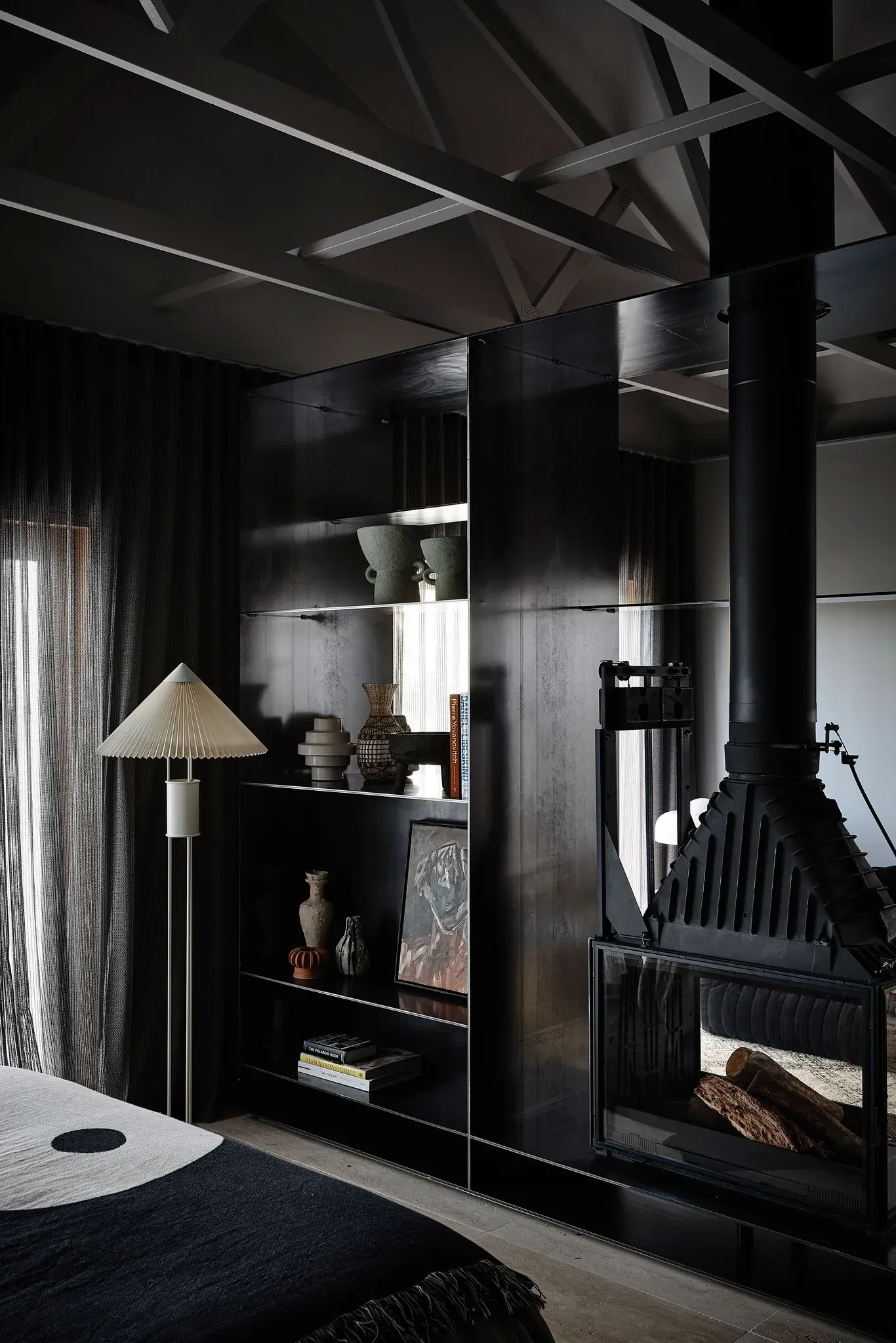 The ingenious blend of vintage Italian and French pieces with contemporary Australian furniture perfectly harmonises with the architecture, culminating in an exquisite and distinctive aesthetic. The lounge area boasts an array of remarkable vintage pieces, such as an Oluce wall light and a 1970s Annie Hieronymus sofa, while the double-sided fireplace effortlessly demarcates the lounge from the bedroom, heightening the intimate atmosphere.