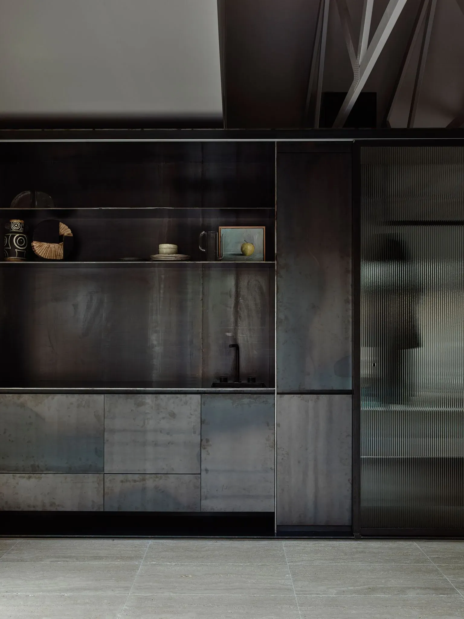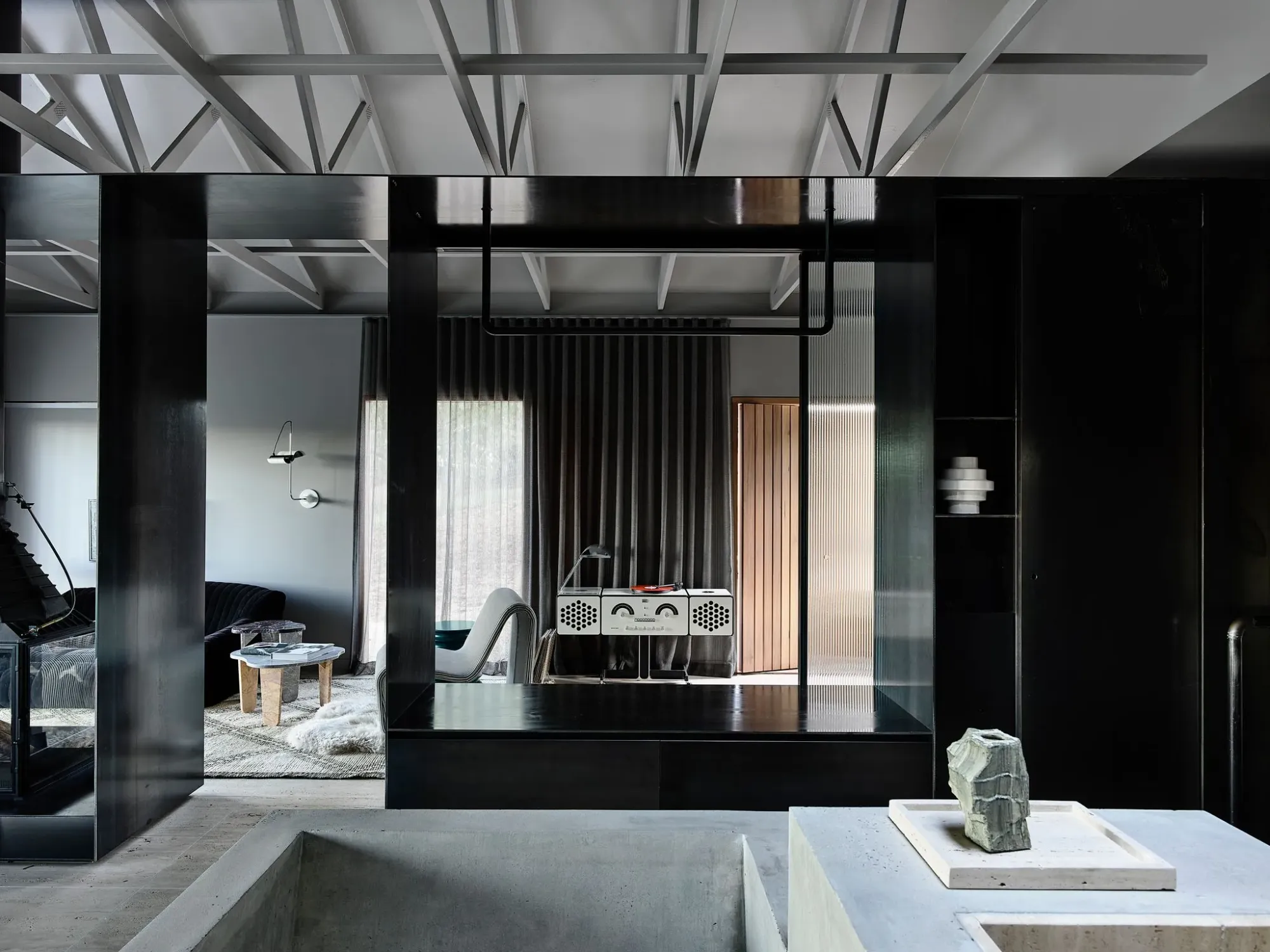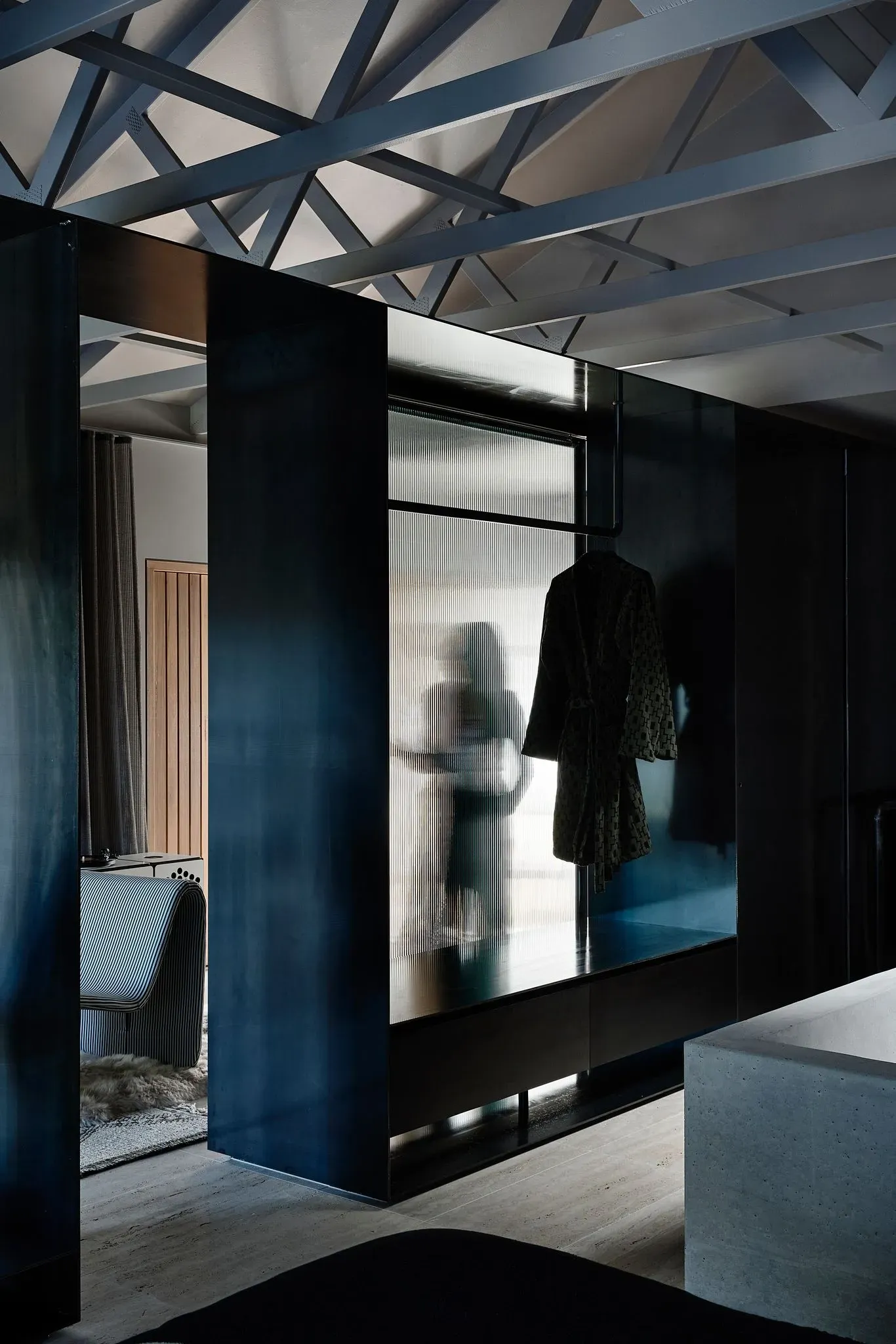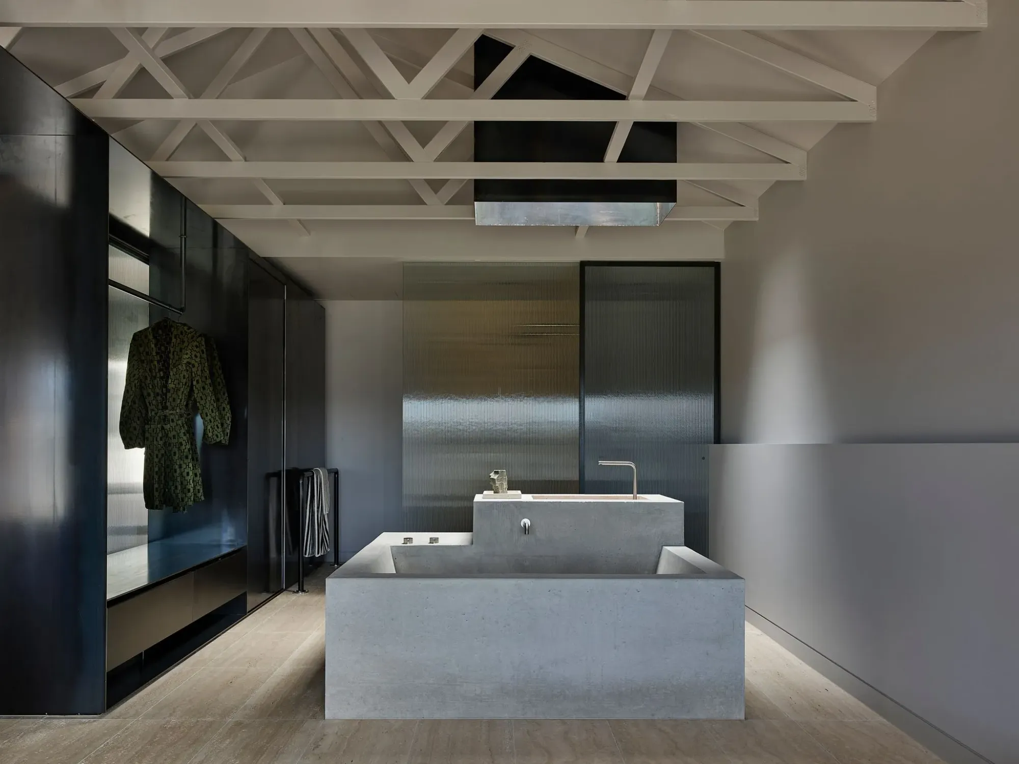 The suite is intelligently divided into two zones by a central reeded glass wall that creates an informal and intimate transition between the spaces. The entry side contains a kitchen, breakfast nook, cozy lounge, and fireplace, while the left-hand side features the main bedroom, robe, and an impressive custom concrete bath and basin dramatically illuminated by a skylight.