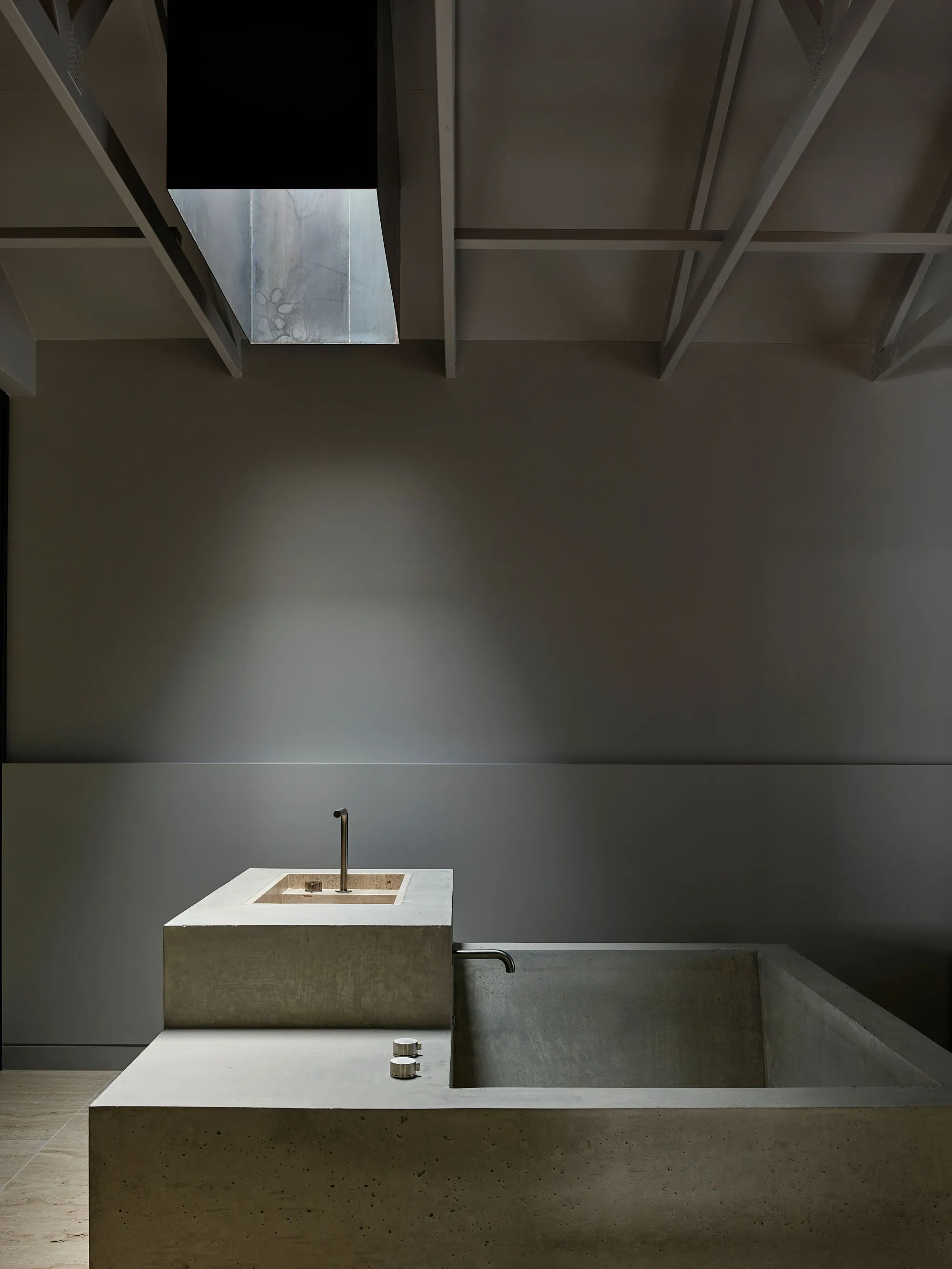 The central steel spine with refined industrial detailing strongly defines the cabin's identity, while the oiled steel kitchen adds a sense of permanence to the space. The travertine floor tiles and traditional ceiling beams pay homage to the region's farmhouses, creating an air of timelessness and comfort. The concrete bath and basin, dramatically illuminated by a skylight, are located in the far-right wing of the cabin, adding to the sense of robust permanence.