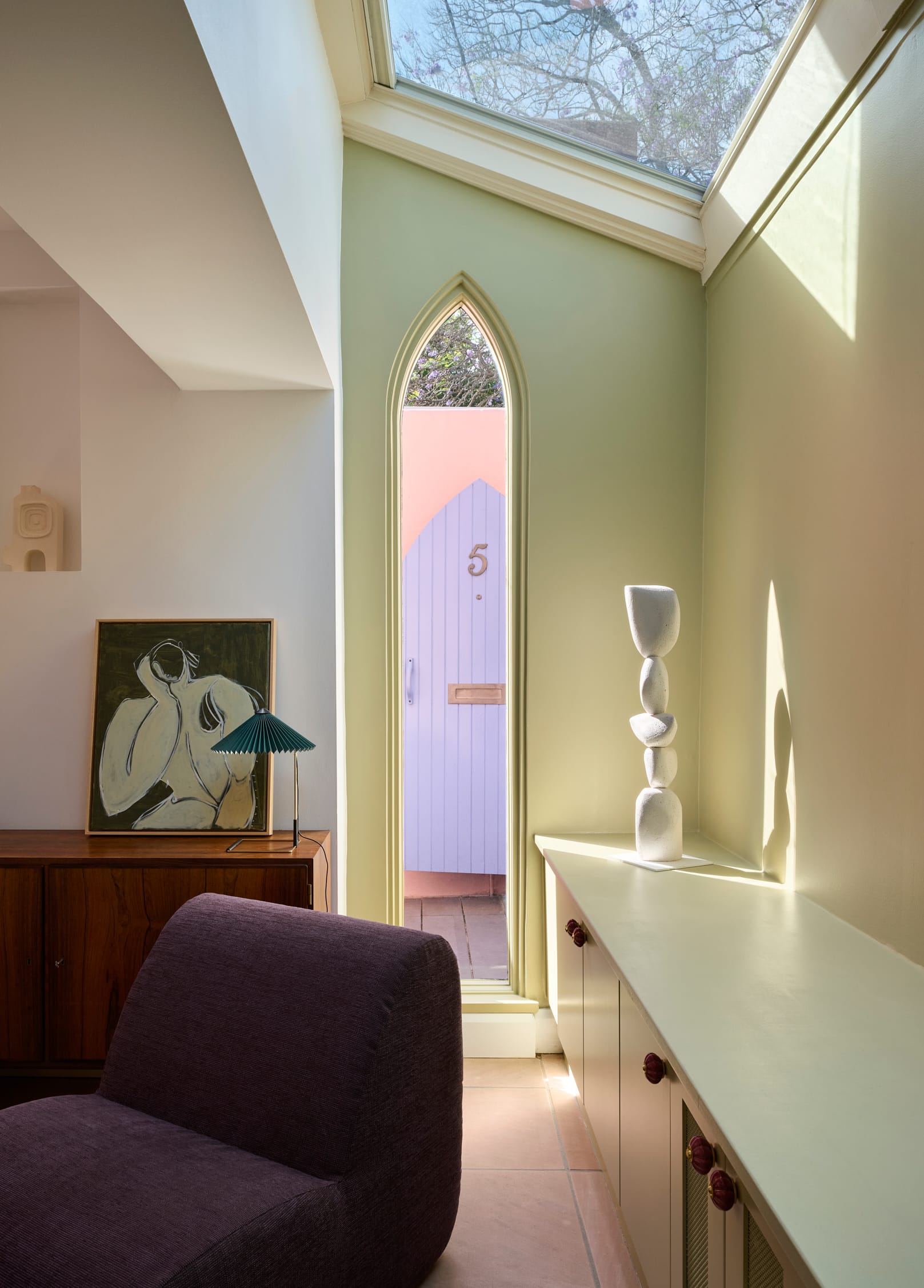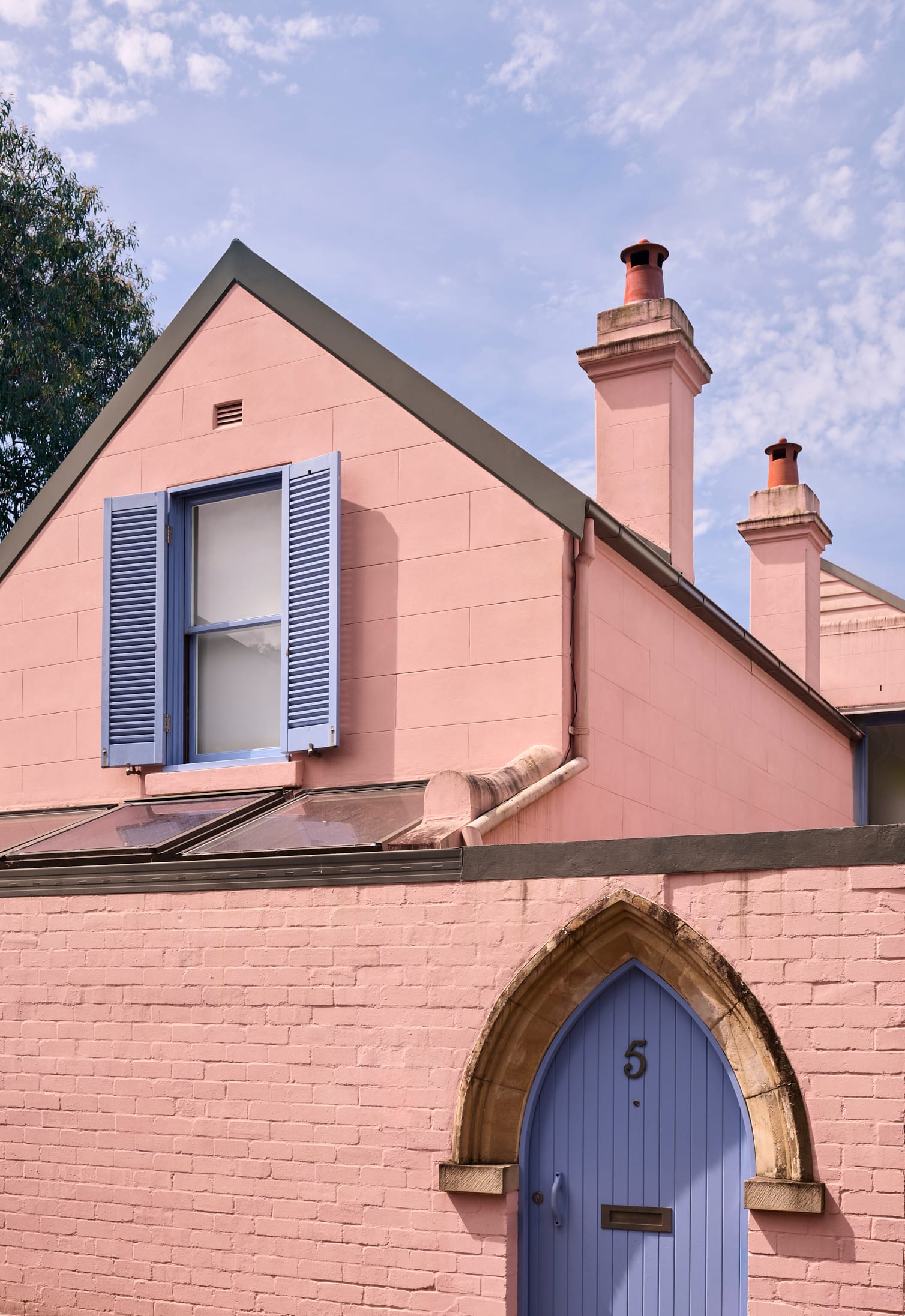 Tucked in amongst the picturesque tree-lined streets of the eastern Sydney suburb of Paddington, Chapel House is a far cry from typical heritage restorations. Fusing a bright palette with the client's eclectic taste and mid-century flair, the home exudes dynamic playfulness inside and out. The bright pinks and blues characteristic of the homes design are balanced against powerful gothic archways and salvaged design elements from a restored 19th-century church, adding additional layers of interest and unique personality to the home.