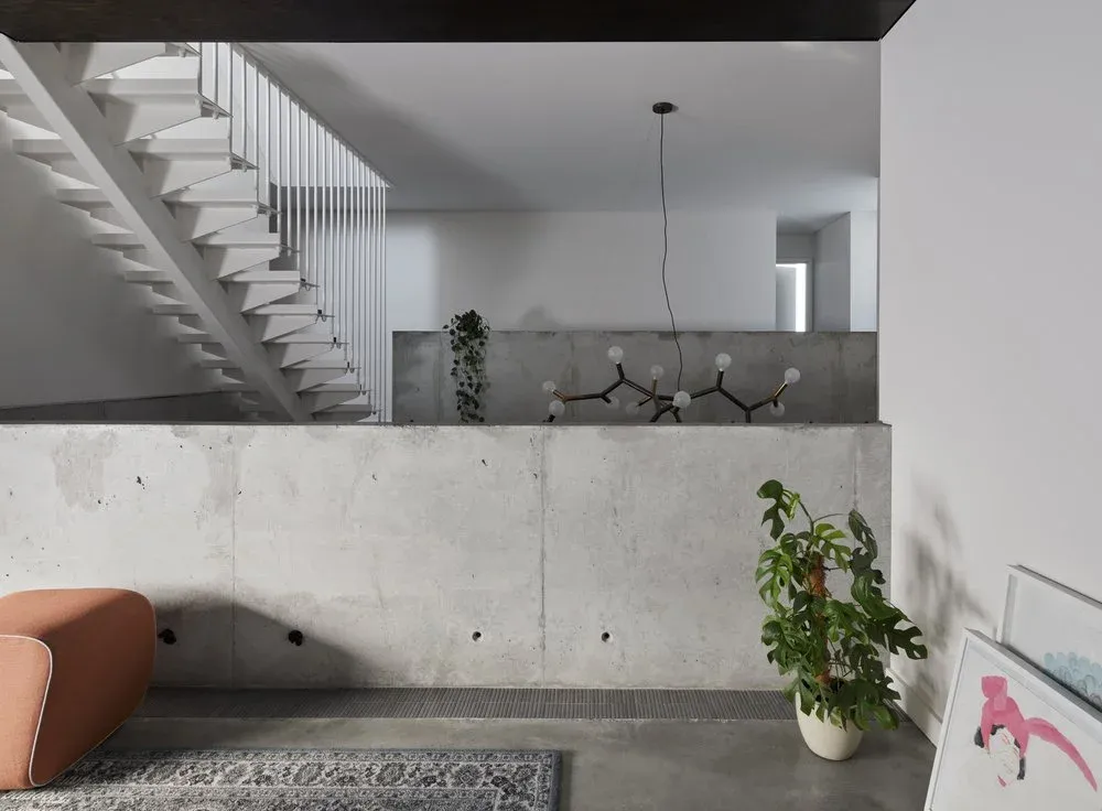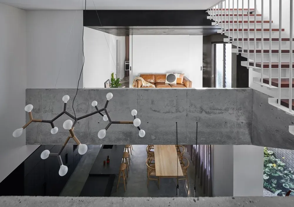 Ground floor living spaces and the private rooms above are all centred around a double-height void that extends throughout the house. The void acts to visually connect spaces and allows for a lofty experience within the smaller-sized block.