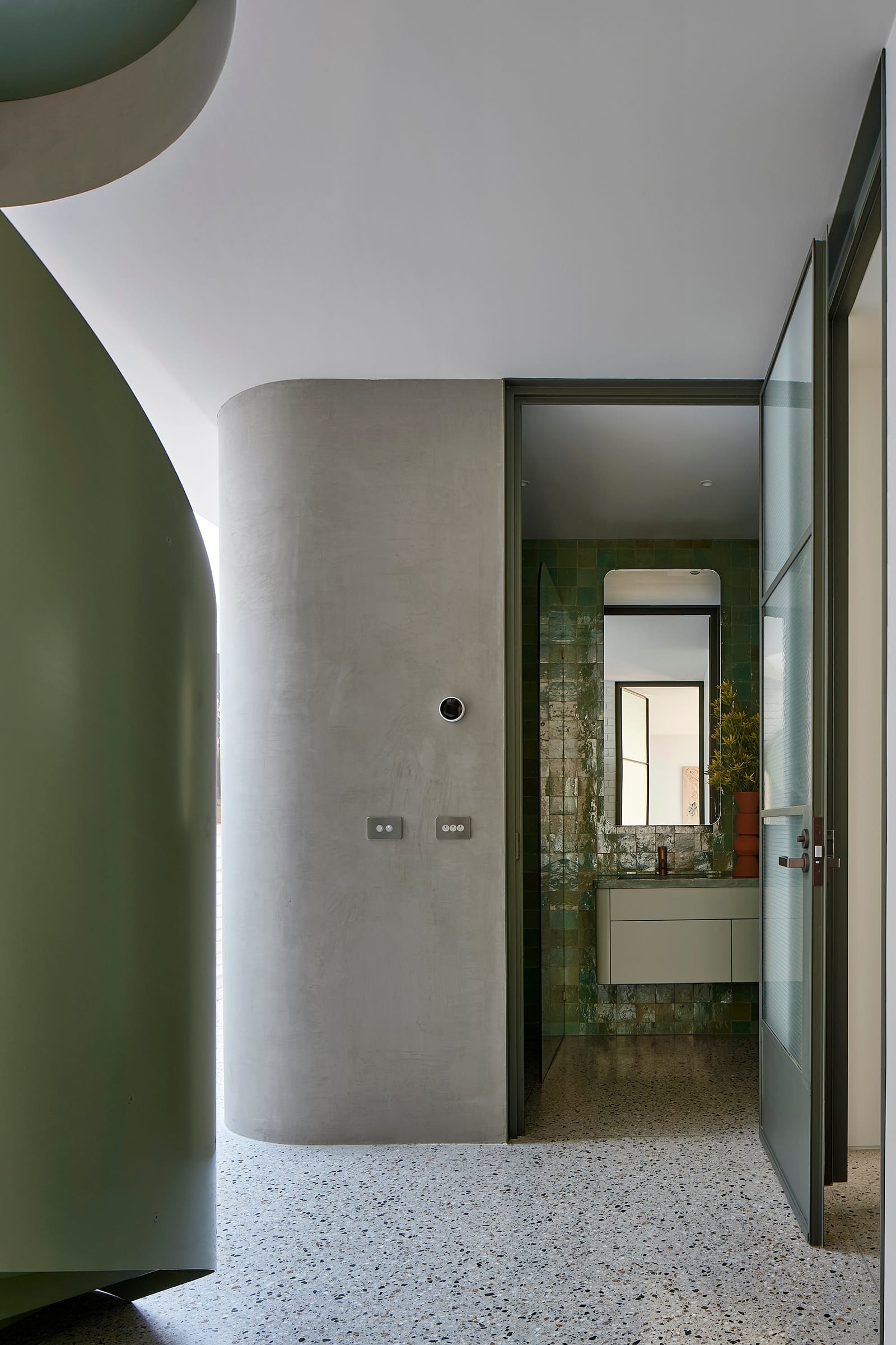 A brick-lined street entrance ushers guests into the expansive white corridor, where sunlight bounces effortlessly across white brick cladding and Venetian plaster, courtesy of an overhead skylight. Curved corners soften the transition through the hallway, defining the route towards the bedrooms, bathrooms, garage and study housed on this ground level. A sculptural spiral staircase takes centre stage on this level enveloped in its own curved wall and revealing the master bedroom suite beyond it.