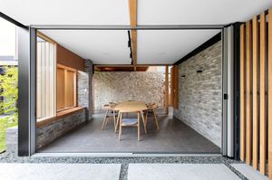 Internally, an asymmetric, butterfly shaped ground-plan deliberately strives to run parallel to the depth of the site rather than the road, creating a quasi “internal street” that runs between the more private zones of children’s bedroom spaces located on one side and living areas on the other. This leaves the upstairs reserved exclusively for a generously sized master bedroom with ensuite and walk-in robe. Conceived simply as a more erudite suburban patio, the area between the ground-floor wings forms a dining space that is simultaneously afforded views and interactions with the front streetscape and surrounding garden.