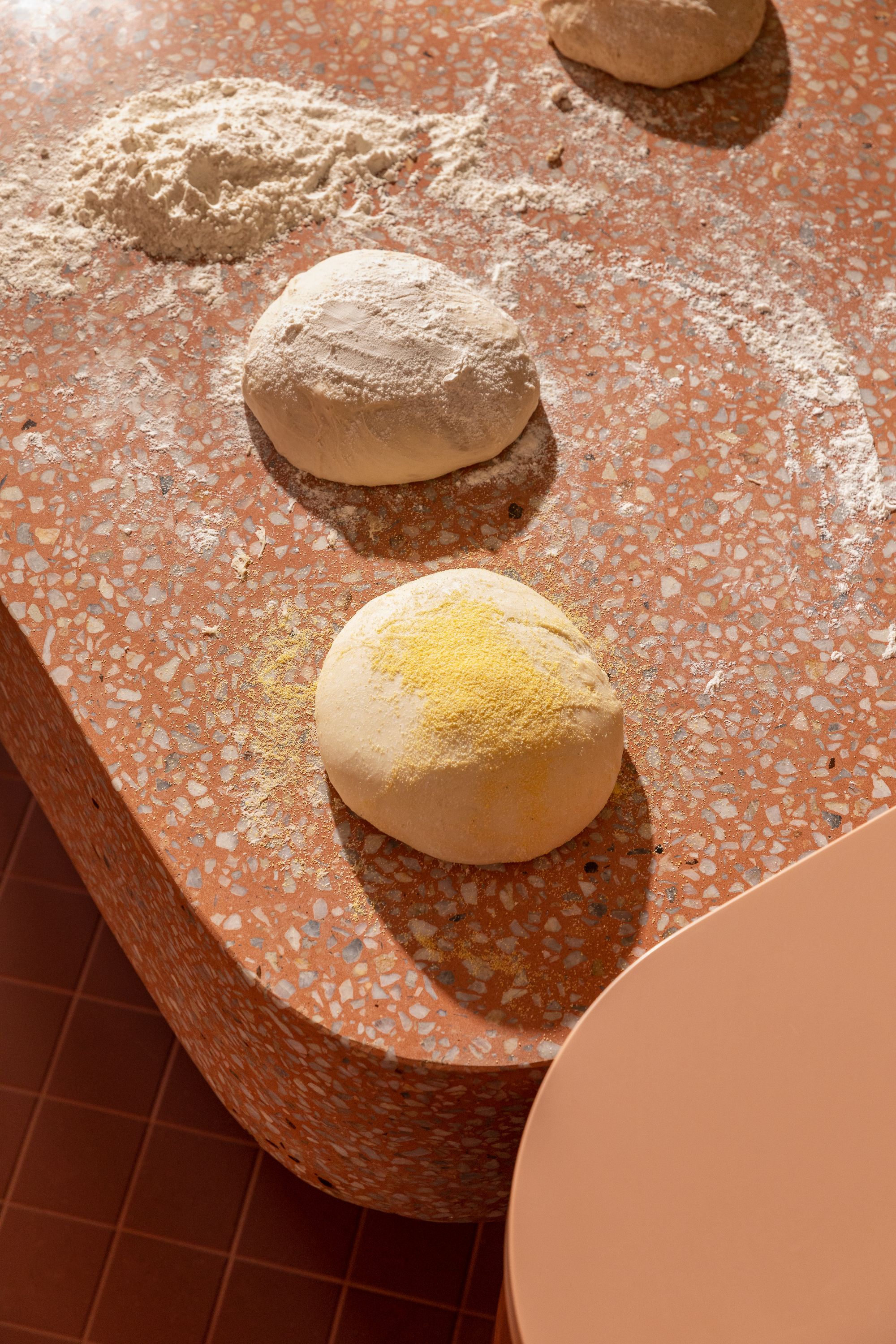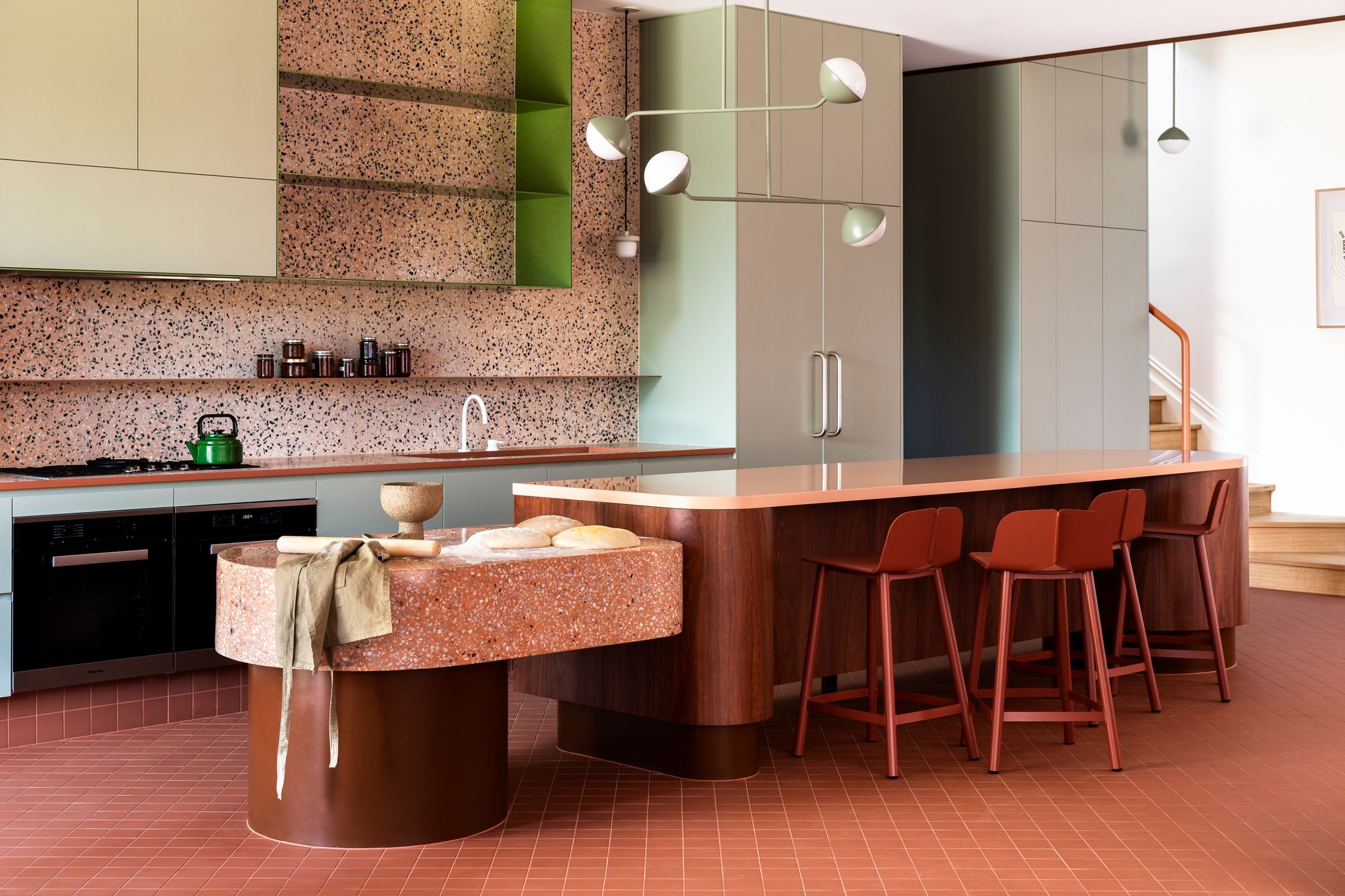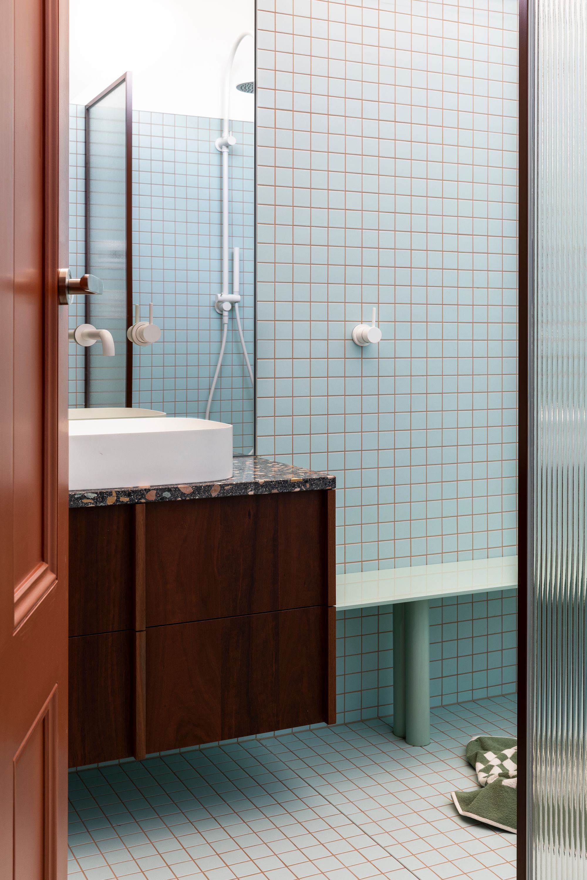 Inside, the main bedroom exudes generosity, complete with a walk-in robe and ensuite. Lift access ensures convenience and accessibility, while the former attic space has been reborn as an exciting rumpus room. The bathrooms bring a burst of energy with their playful colours, paying tribute to the stained glass motifs. The hard-working kitchen is intelligently divided into two functional spaces, seamlessly connecting the back of the house with the laundry, backyard, and clothesline. The multi-functional kitchen island features a lower concrete plinth, offering a heat-safe counter opposite the oven, as well as a custom kneading bench at the perfect height for the client and their son.