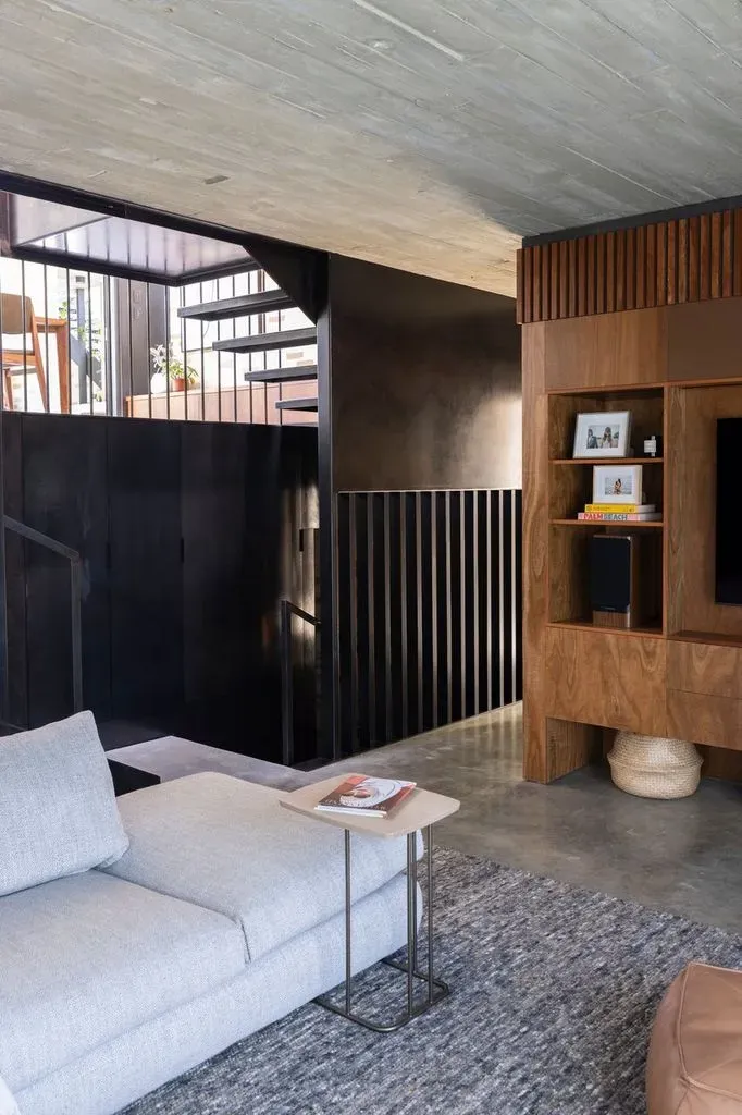 These shifting levels and their relationship to one another are beautifully handled in the interior spaces. Batten walls provide visual and spatial connection across the delineating stair voids knitting spaces together internally, while high-level ribbon windows and operable screens curate privacy and views to the street, the sky and the neighbourhood.