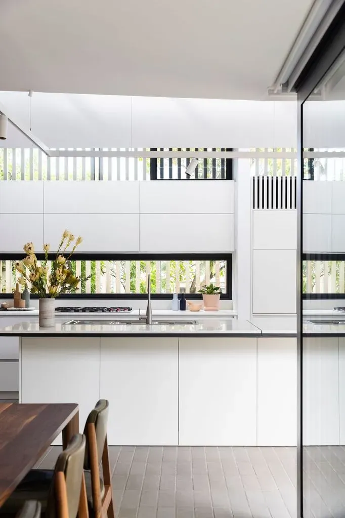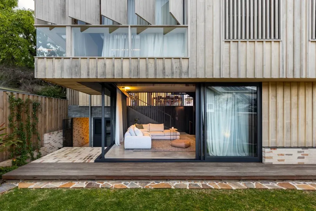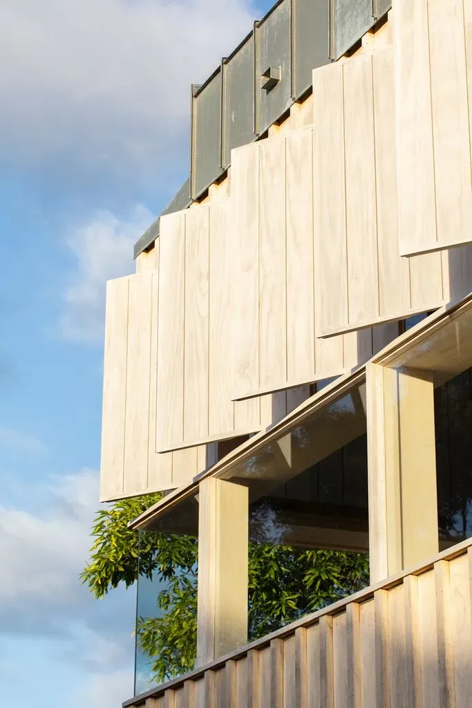 Higham Road House works well passively, with its carefully considered materials and orientation, and its array of shutters and batten screens which admit northern sun in winter to capture heat in the thermal mass, while repelling the hot sun in summer. These passive approaches and cross ventilation are supplemented in summer with three highly efficient independent high-volume dual-fan condensers and underfloor hydronic heating in winter.