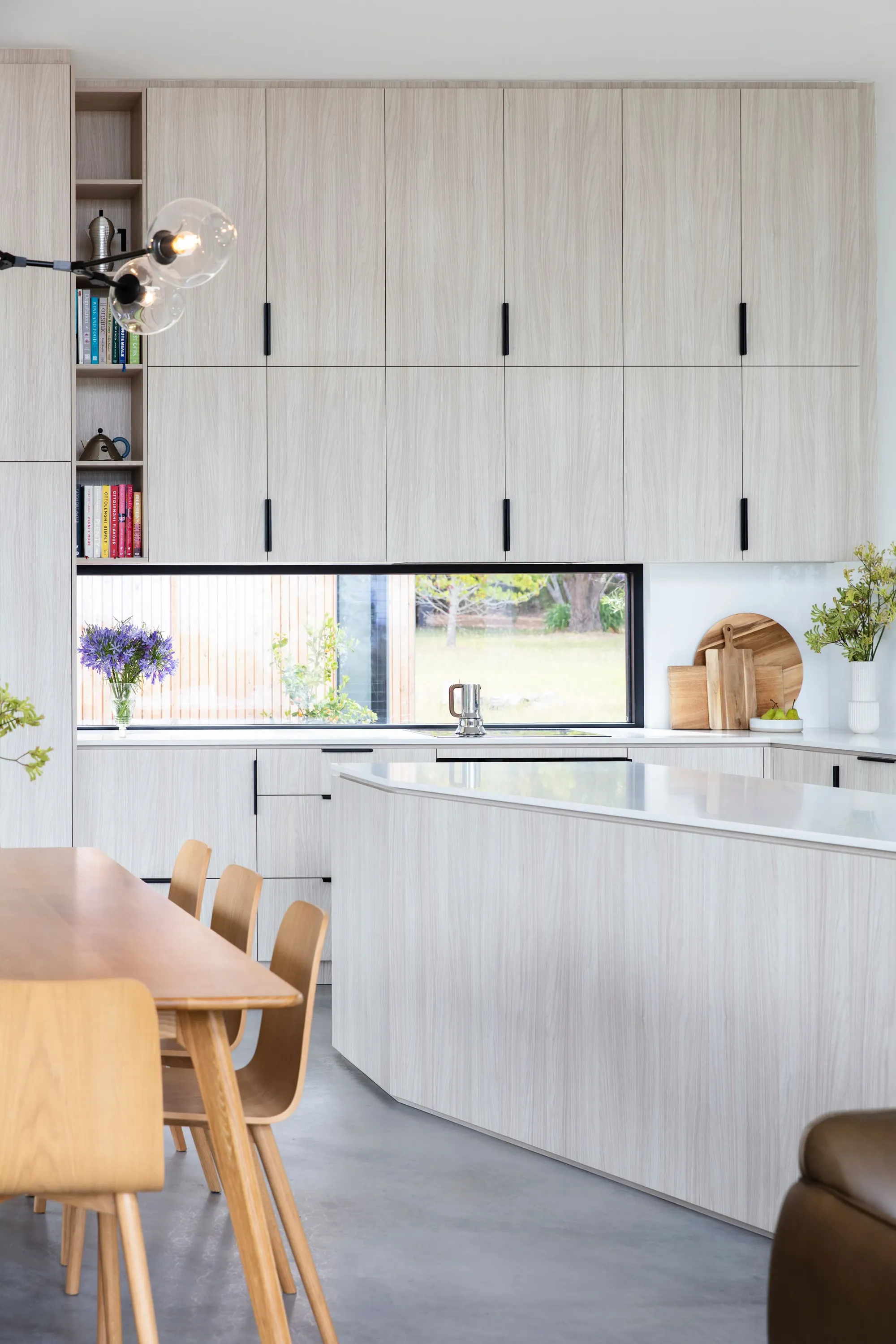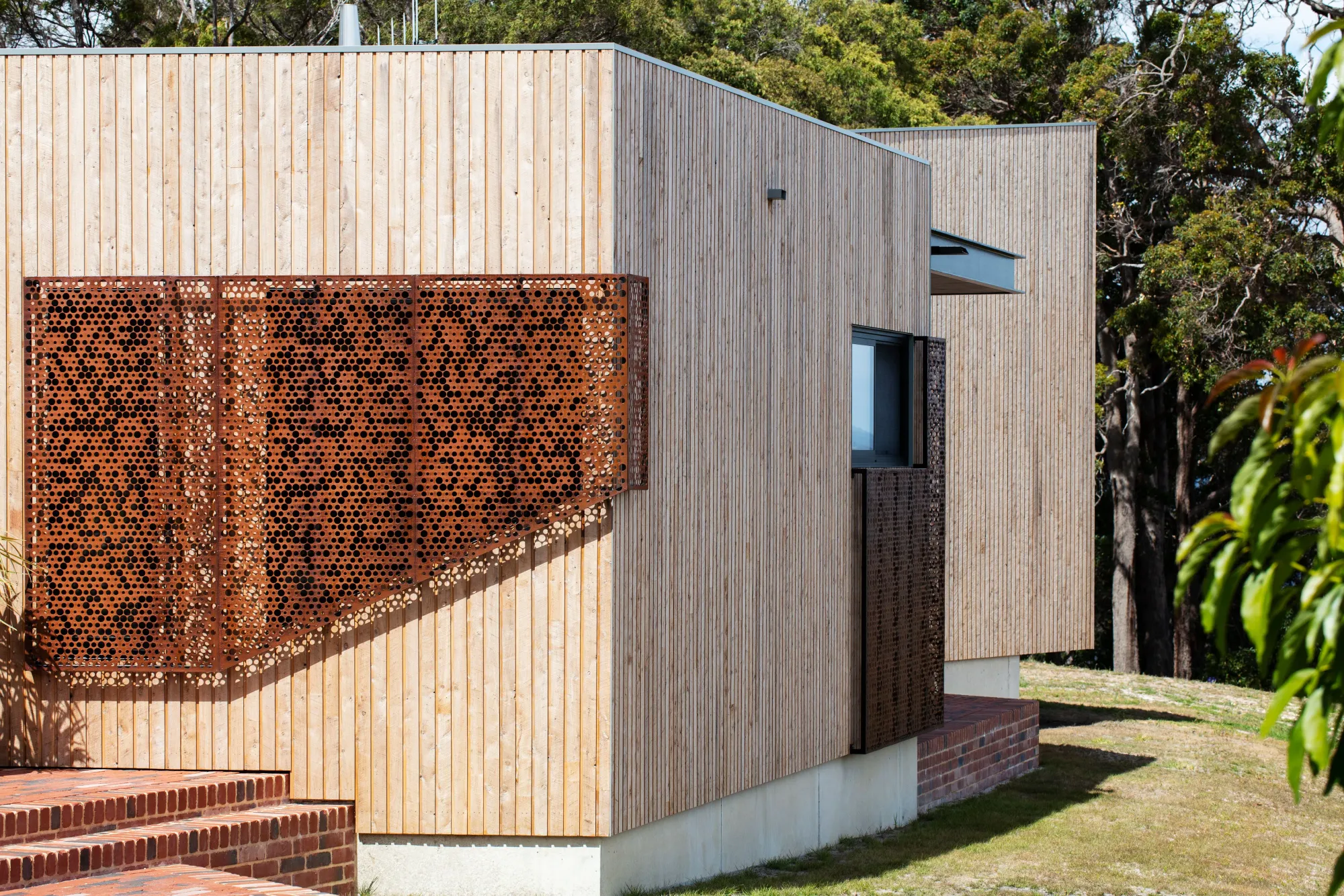 Sustainability is key to the home with clever design negating the need for air conditioning or heating. Automated louvered window sections at either end of the house cool the forms quickly in summer, while the thermal mass of the concrete spine controls the internal temperature in winter. A solar panel energy system and an efficient heat pump hot water system are also employed. A large sliding perforated glazing and Corten steel panel is opened in winter and closed in summer. David notes, “The clients are happy to put on a jumper if they feel cold but the home performs well without heating or cooling...there is a fireplace, but it’s really for ambience.”