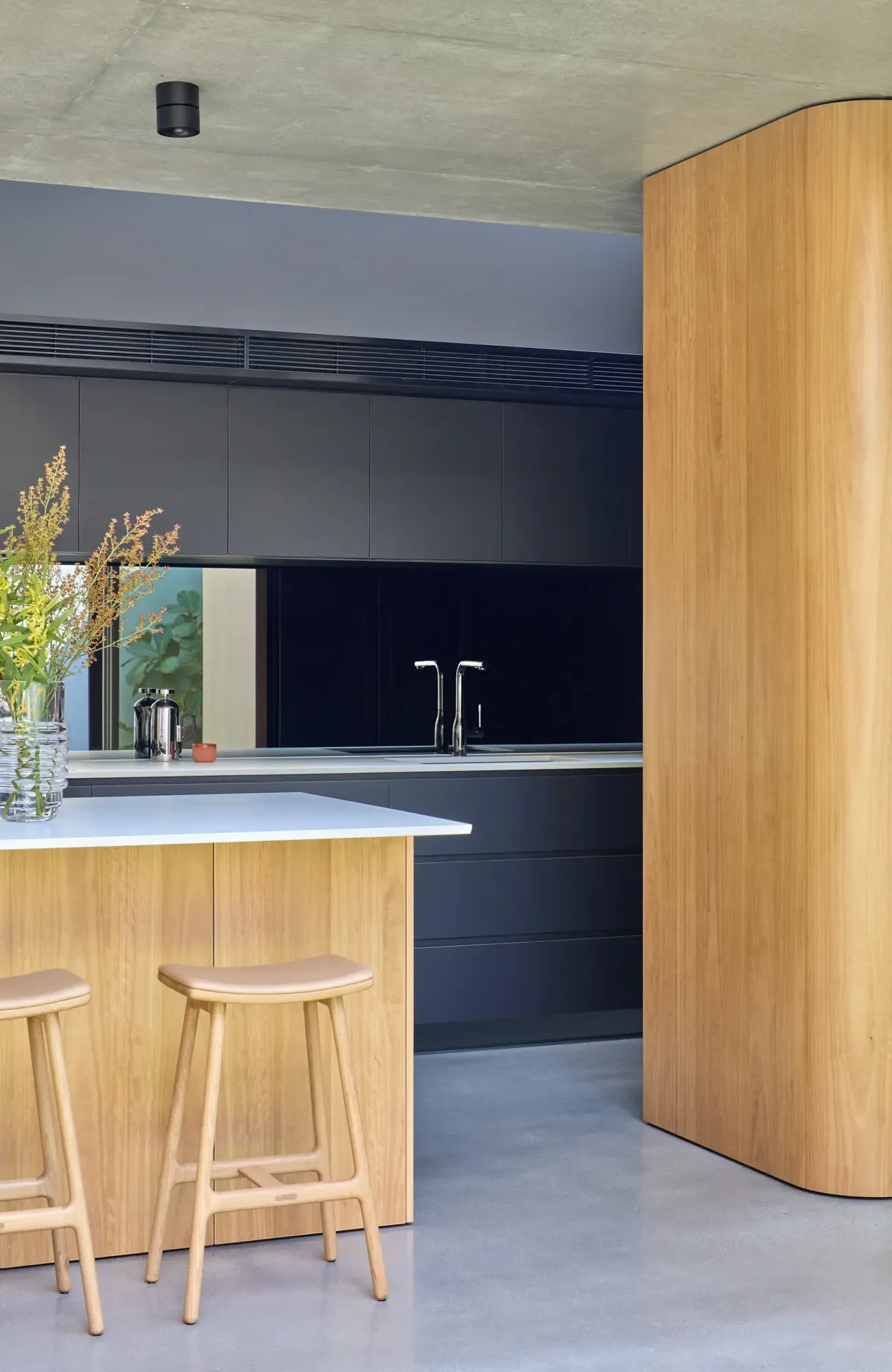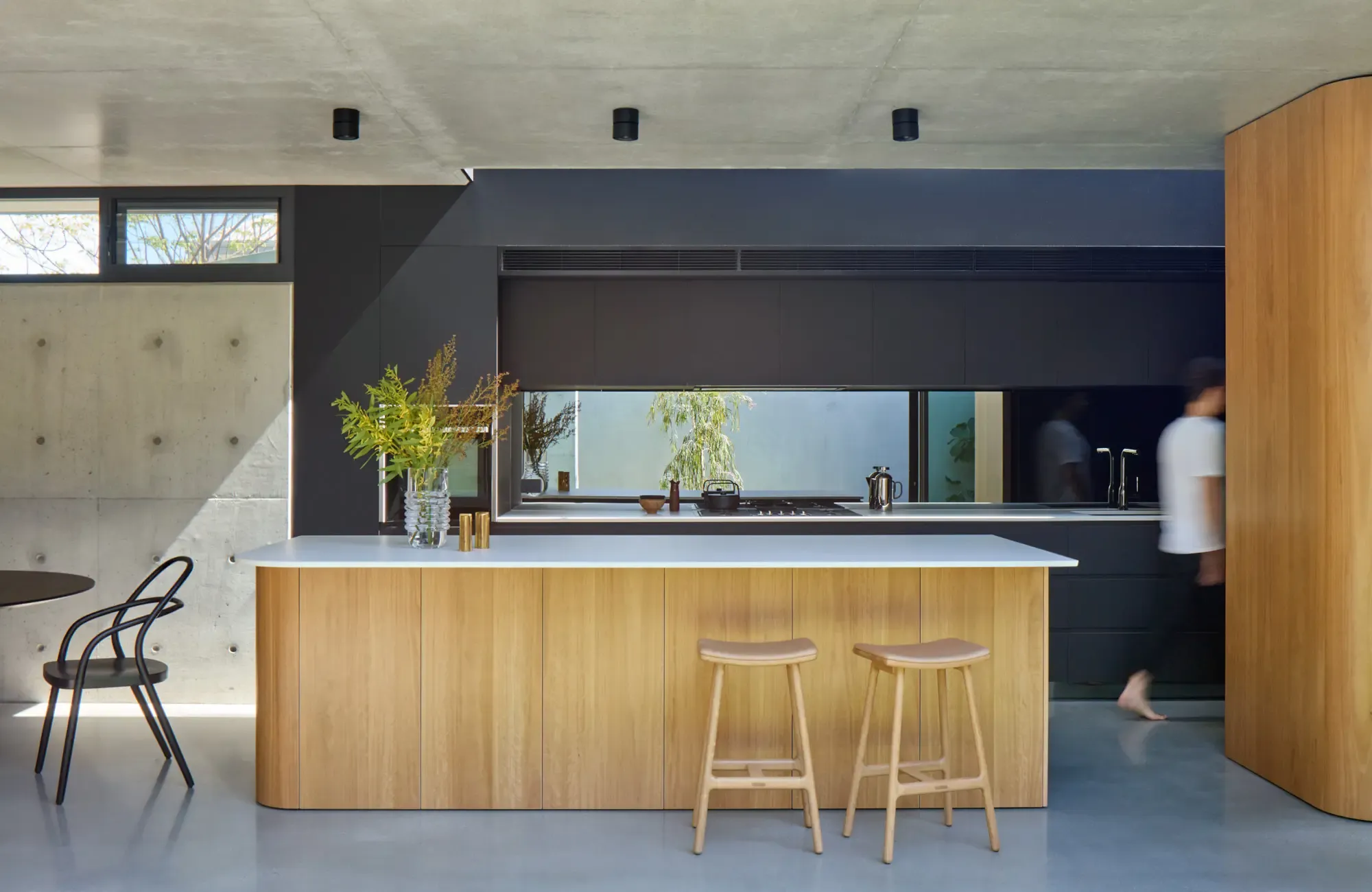 The design of Little Albion thoughtfully combines off-form concrete walls and ceilings with the warmth of natural Australian Blackbutt timber and Silvertop Ash timber cladding, resulting in a unique and inviting aesthetic. The goal was to create a home that not only meets the functional needs of the clients, but also reflects their vision for a modern and stylish retirement residence by the beach, full of texture, light, and functionality, in contrast to the old cottage.