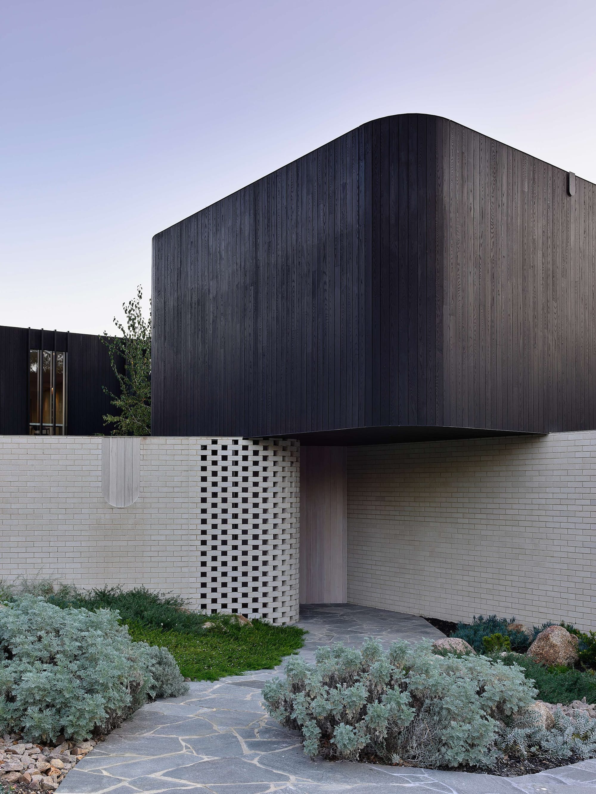 A new 600m2 family home, designed over two and a half levels. The robust brick walls of the ground level is designed as two linear wings, with a sweeping curve corridor link, central to this plan is a private and sun-filled courtyard. Perching above the brick is a darken timber element which holds the main living spaces, this form then wraps around a central maple tree while reaching out to capture the view of the neighbouring golf course.