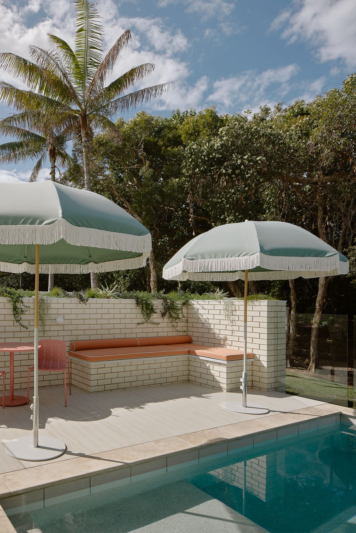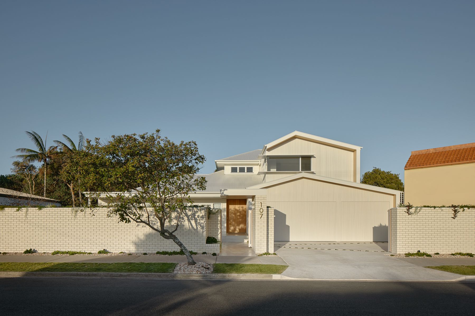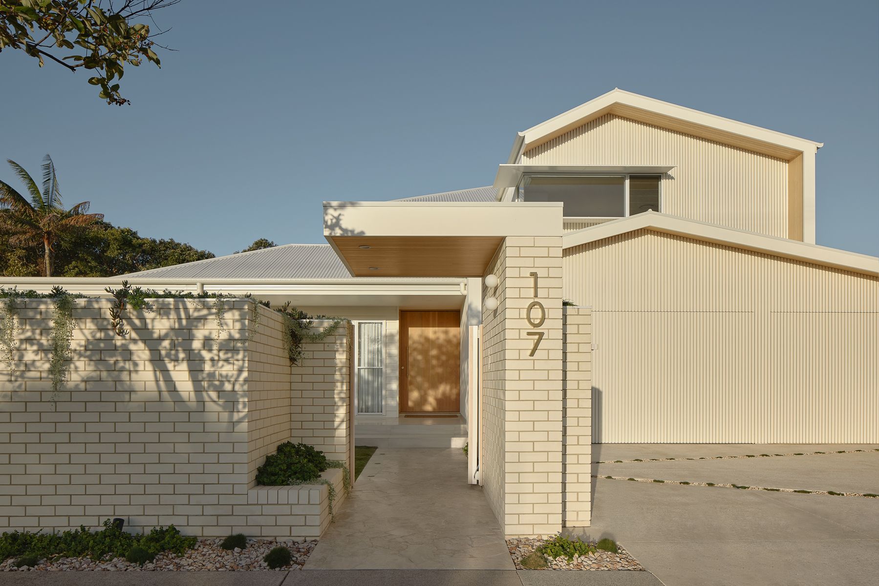 At its core, Oceanic House stands as a testament to the delicate balance between preserving the essence of a home and infusing it with a new, personalised character. The modernist-inspired façade, bathed in a serene cream hue, harmoniously blends traditional pitched roofing with contemporary gabled elements. The tactile allure of white brickwork deepens the design narrative, while a welcoming wooden door beckons visitors. Mindful of its Queensland backdrop, this residence both harmonises with its neighbours and boldly declares its unique presence.