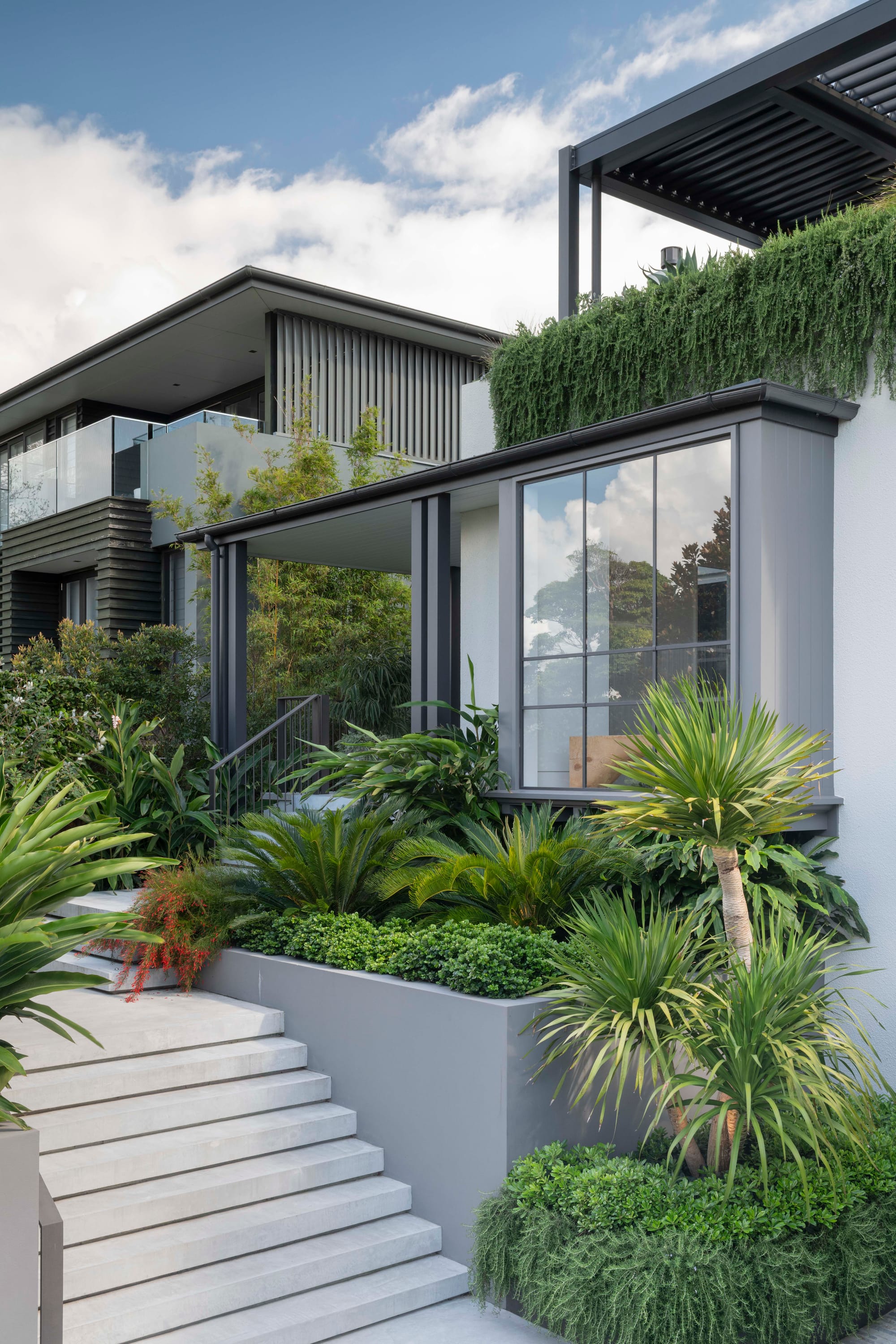 The front façade and connecting layered gardens provide a striking introduction to the Taylors Bay residence, offering a preview of what to expect from the property. Creating a clear sense of arrival was a key focus of the landscape intervention. Previously lacking clarity, the entry sequence is now defined by hedges and an abundance of greenery that clearly delineates the pedestrian entry from the driveway. The off-form finish introduces subtle texture and depth, giving the concrete a tactile quality that sits comfortably alongside the character of the Federation façade. A half-turn staircase leading to the main door is lined with lush, layered planting, creating a welcoming and immersive approach.