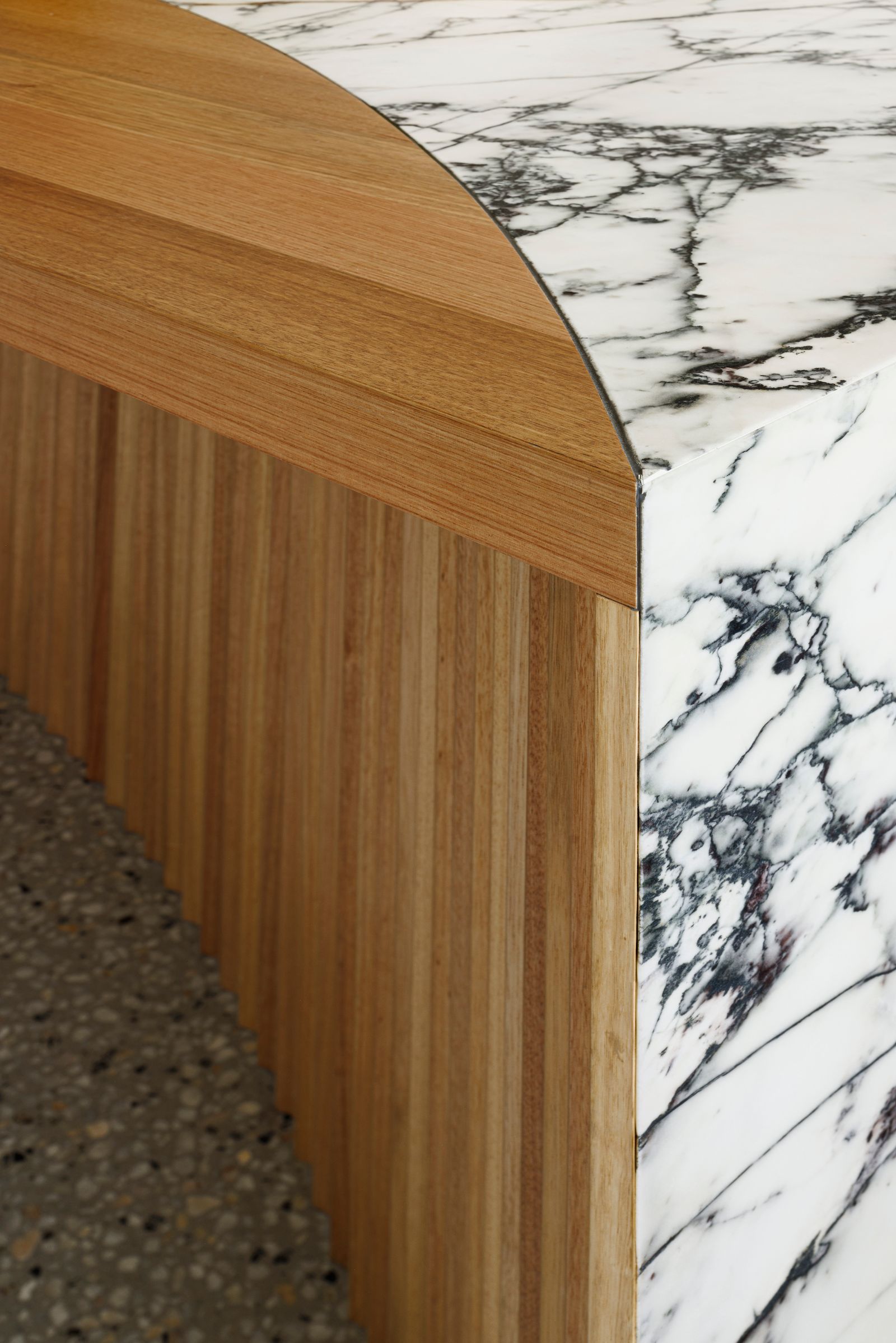 A stone island bench, inset with a sweeping inlay of solid timber, serves as the centrepiece of the kitchen. It mirrors the curved profile of the rear sliding door, which acts as an organic aperture to the eclectic landscape beyond. Collaborating with Jo Ferguson Gardens, the surrounds of Tiara House showcases a captivating mix of native, cottage, and Mediterranean species, weaving together indigenous history, the site's past, and the clients' personal narratives.