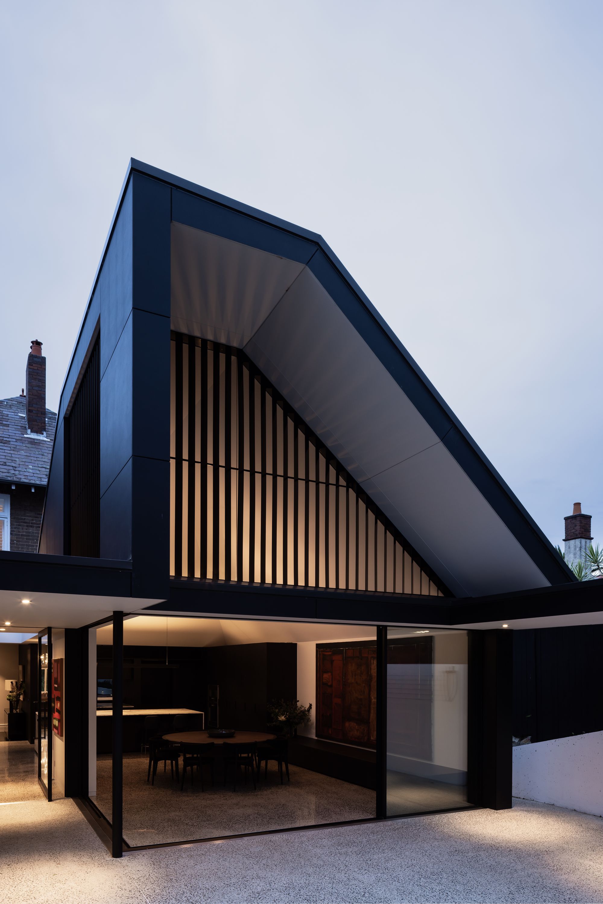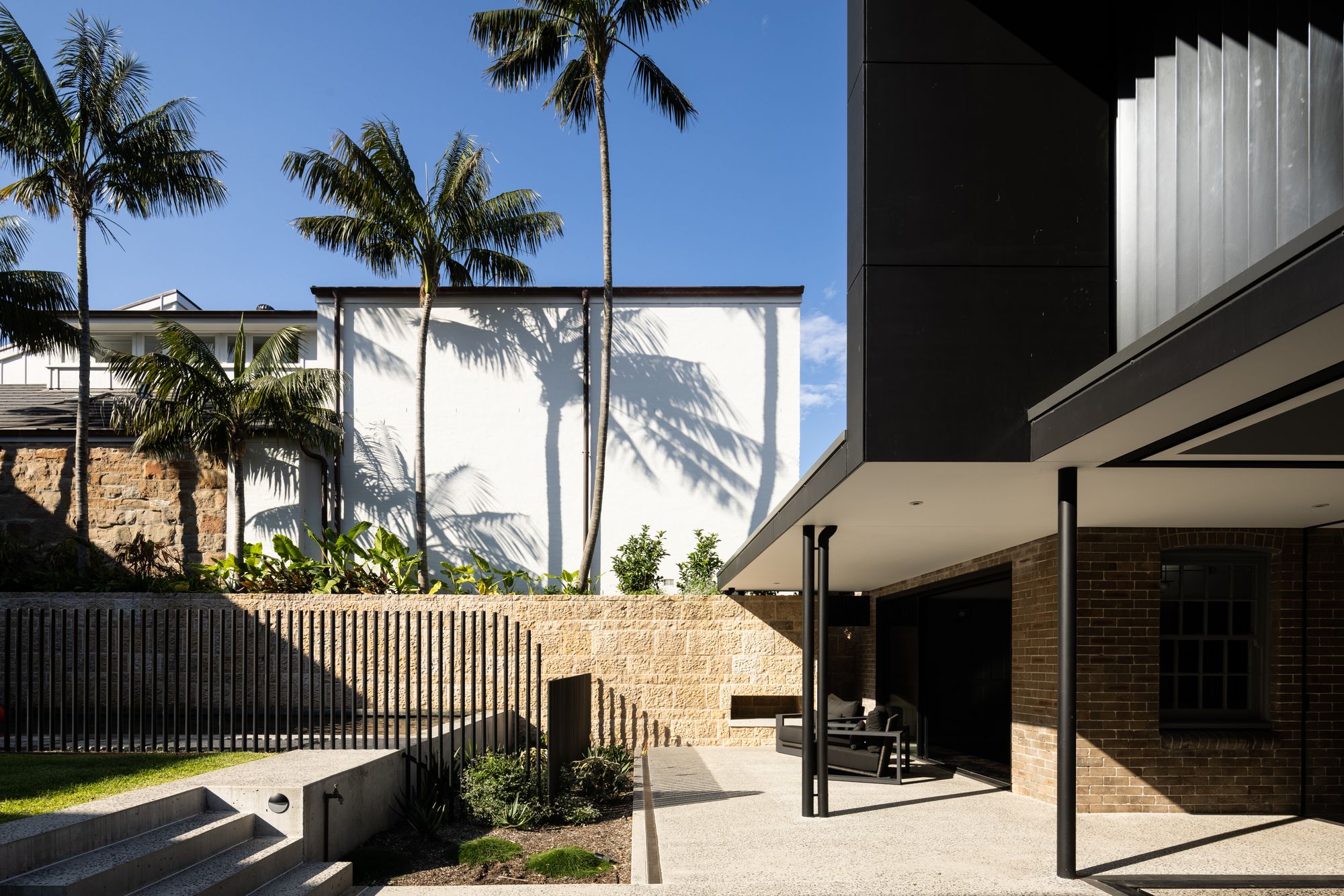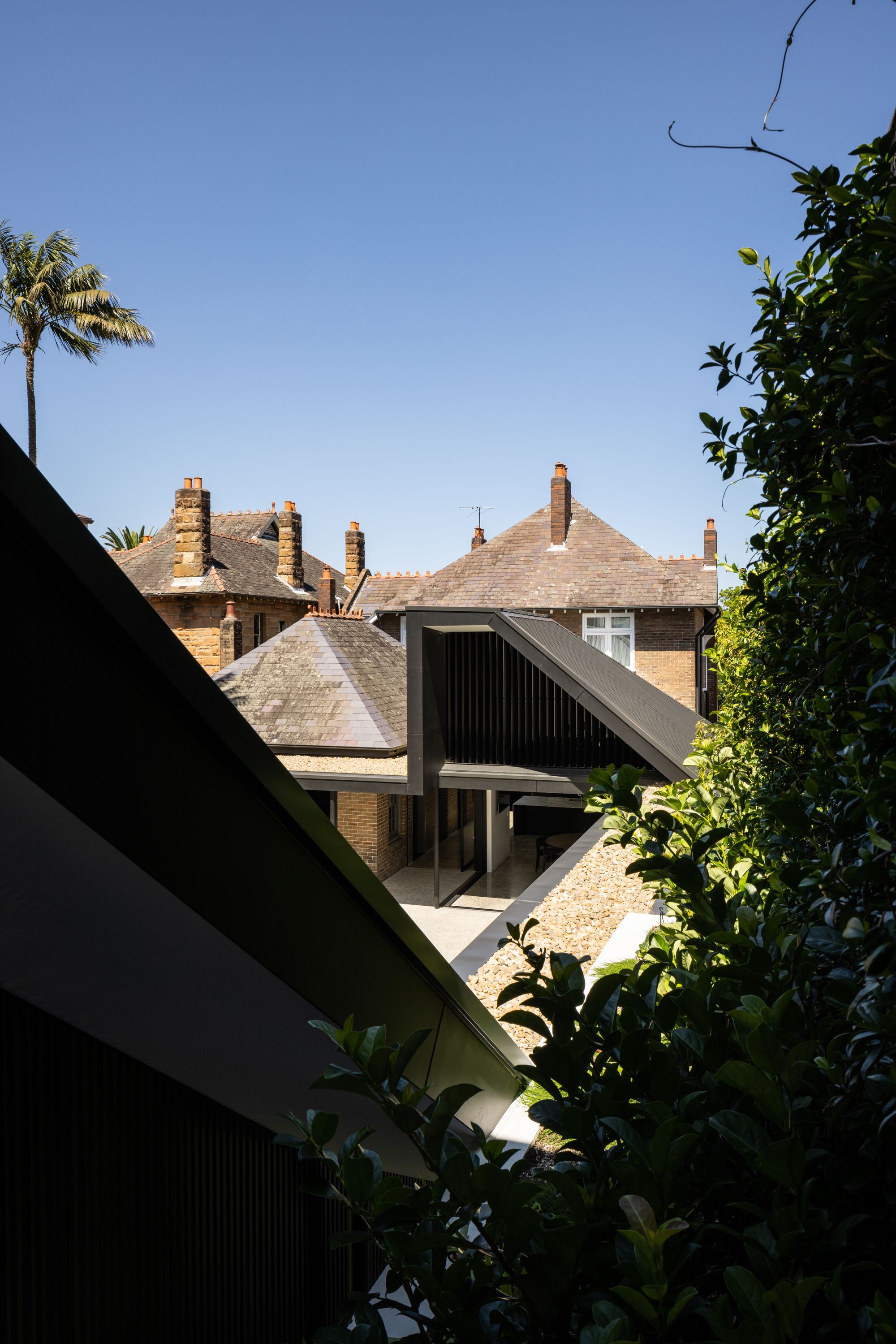 Tongkah sits proudly among heritage-listed homes, mirroring the grandeur of Centennial Park and providing a distinct contrast to the 1960s housing blocks nearby. Its rear addition, with its modern volume and dark metal cladding, acts as a visual counterpoint, demonstrating how contrast can breed respect and interest in a heritage-rich setting.