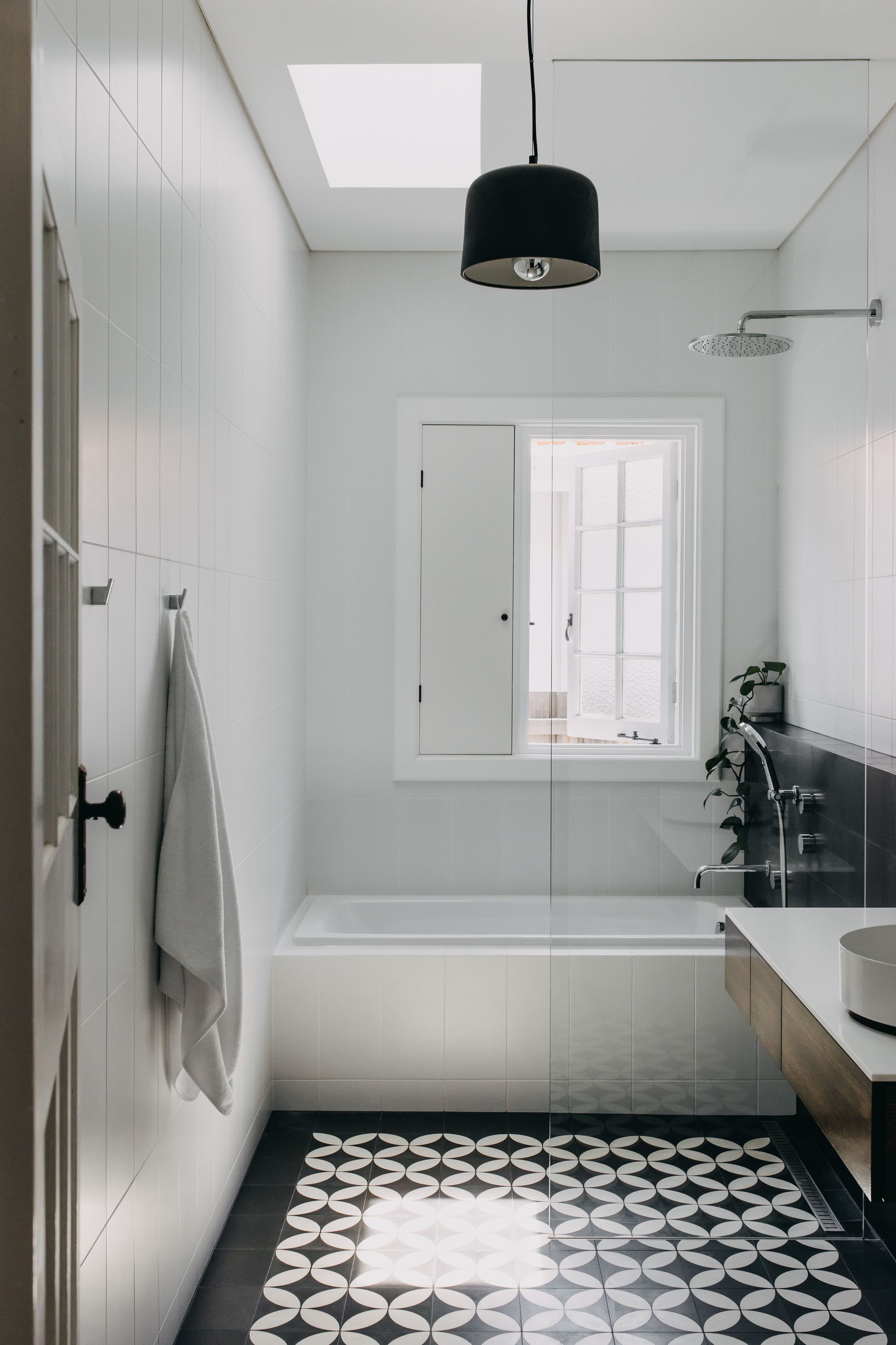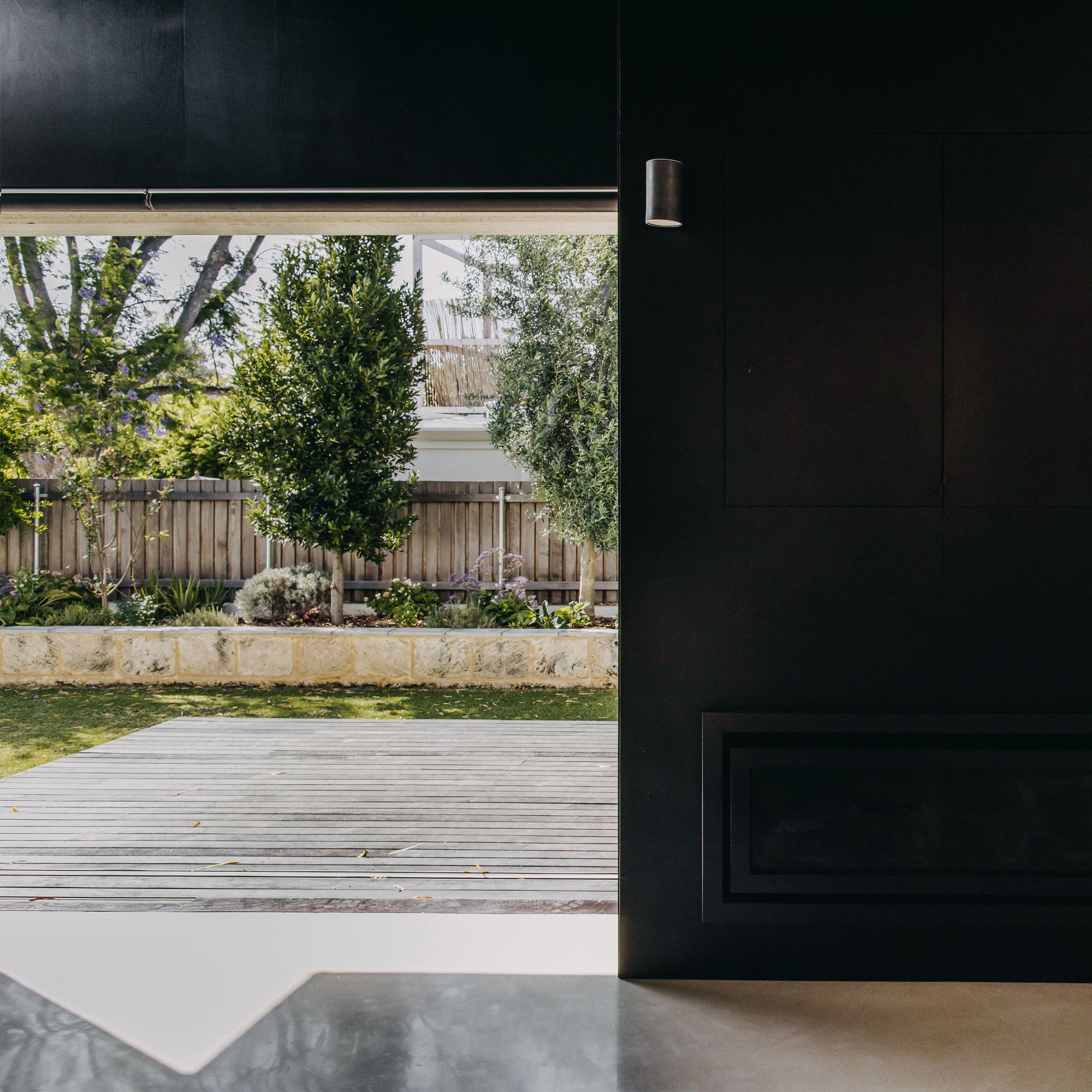 Internally, the home has come to be defined by a resolutely monochromatic interior palette that was largely employed as a means of unifying the new finishes with some of the original period-home features. The clients were keen to be involved in restoring as much as possible. However, the interior is also a product of the desire to create an easy to clean home. These aims are expressed, for example, in the stainless-steel benchtops and splash backs as well as the combination of darkened timber and burnished concrete flooring.