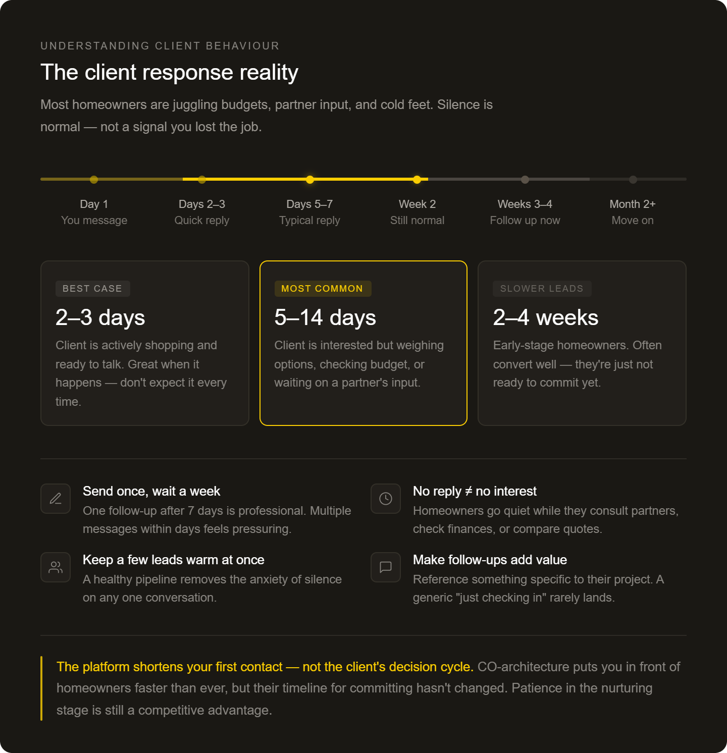 CO-architecture connects you with homeowners who have already had an initial conversation and a shaped brief. It does not guarantee a response or a project. Your results will depend heavily on how you handle that first contact and what you do next.